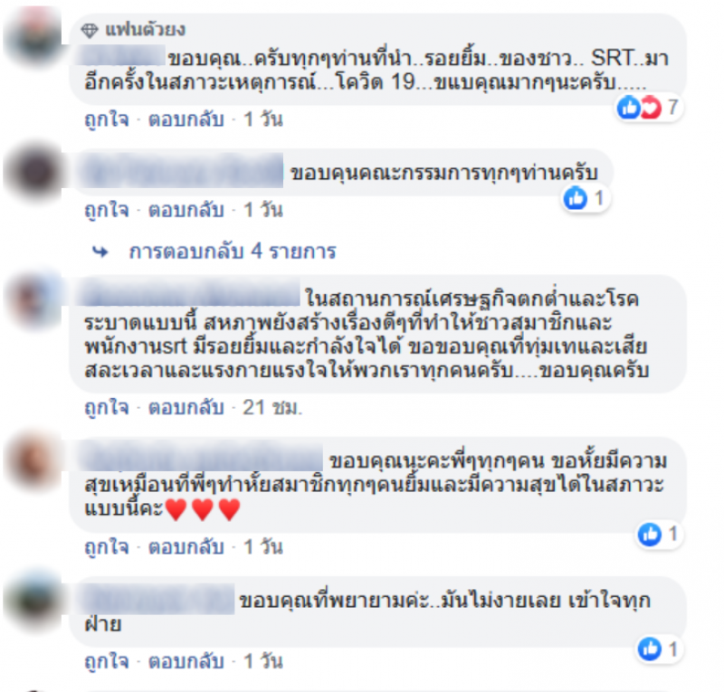 โดยหลังจากที่ได้มีการประกาศ ก็ได้รับเสียงชื่นชม เช่น มีชาวโซเชียลท่านหนึ่งบอกว่า ในสถานการณ์เศรษฐกิจตกต่ำและโรคระบาดแบบนี้ สหภาพยังสร้างเรื่องดี ๆ ที่ทำให้ชาวสมาชิกและพนักงาน srt มีรอยยิ้มและกำลังใจได้ ขอขอบคุณที่ทุ่มเทและเสียสละเวลาและแรงกายแรงใจให้พวกเราทุกคนครับ ขอบคุณครับ อีกท่านกล่าวว่า ขอบคุณค่ะ ในภาวะวิกฤตโรคโควิดและเศรษฐกิจแบบนี้ ได้ขนาดนี้ก็ดีมากแล้วค่ะ