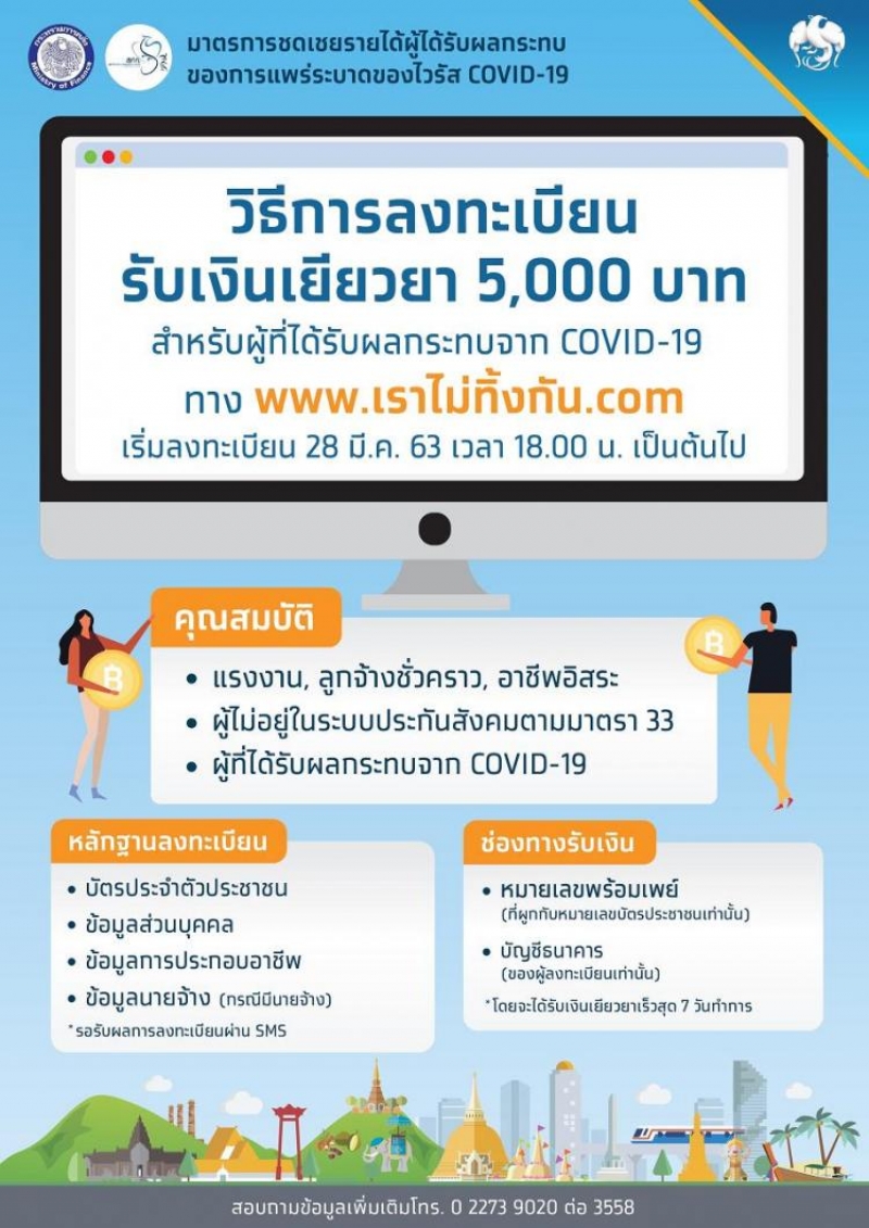 แรงงาน ลูกจ้างชั่วคราวและอาชีพอิสระที่ได้รับผลกระทบการแพร่ระบาดของ covid-19 สามารถลงทะเบียนเข้าร่วมมาตรการได้ตั้งแต่วันเสาร์ที่ 28 มีค2563 เวลา 18.00 น. เป็นต้นไป ผ่านเว็บไซต์ wwwเราไม่ทิ้งกัน.com ที่เปิดตลอด 24 ชั่วโมง