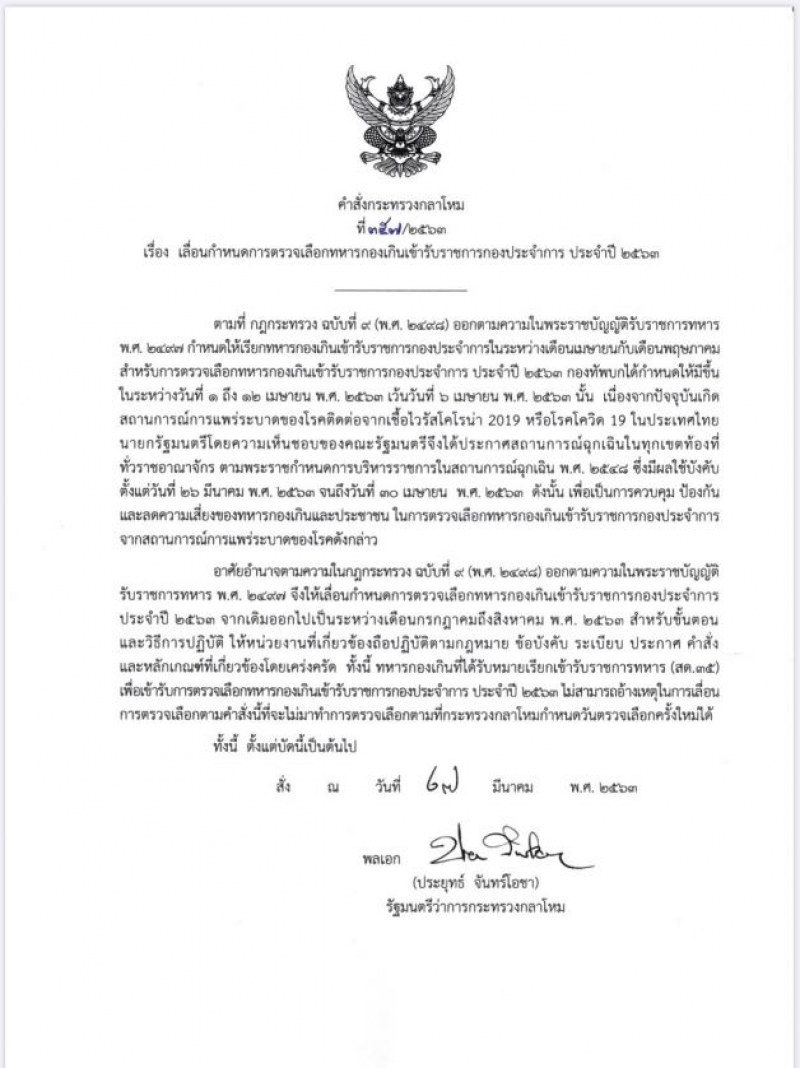 พล อ ประยุทธ์ จันทร์โอชา นายกรัฐมนตรี และรัฐมนตรีว่าการกระทรวงกลาโหม ลงนามคำสั่งให้เลื่อนเกณฑ์ทหารประจำปี 2563 ไปเป็นเดือนกรกฎาคม ถึง สิงหาคม ในคำสั่งกระทรวงกลาโหม ที่ 357/2563 เรื่องเลื่อนกำหนดการตรวจเลือกทหารกองเกิน เข้ารับราชการกองประจำการ ปี 2563 โดยระบุว่า