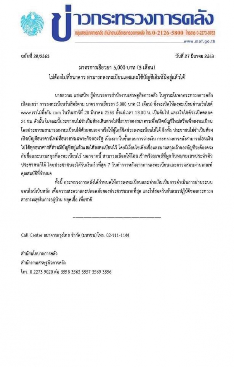 กระทรวงการคลัง แถลง มาตรการเยียวยา 5000 บาท 3 เดือนไม่ต้องไปที่ธนาคาร สามารถลงทะเบียนเองและใช้บัญชีเดิมที่มีอยู่แล้วได้ นายลวรณ แสงสนิท ผู้อำนวยการสำนักงานเศรษฐกิจการคลัง ในฐานะโฆษกกระทรวงการคลัง เปิดเผยว่า การลงทะเบียนรับสิงหาคม มาตรการเยียวยา 5000 บาท 3 เดือน ซึ่งจะเปิดให้ลงทะเบียนผ่านเว็บไซต์ www เราไม่ทิ้งกัน com ในวันเสาที่ 28 มีนาคม 2563 ตั้งแต่วลา 18 00น เป็นตันไป และเว็ปไซด์จะเปิดตลอด24ชม