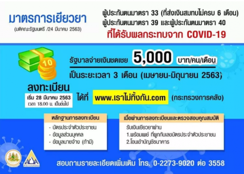 วันนี้ 28 มีค 63 จากกรณีรัฐบาลมีมาตรการเยียวยา covid-19 ในการช่วยเหลือผู้ประกอบอาชีพอิสระ โดยจะเป็นการจ่ายเงินจำนวน 5000 บาทต่อเดือน เป็นเวลา 3 เดือนต่อกัน ซึ่งผู้ที่ต้องการขอรับการเยียวยาสามารถทำเรื่องได้ที่ www.เราไม่ทิ้งกัน.com เวลา 18 00 น วันนี้