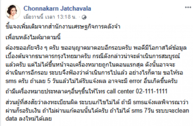 จากกรณีที่ทางรัฐบาลได้เปิดให้ลงทะเบียนรับเงินชดเชยรายได้ เนื่องจากพิษcovid-19 ผ่านทาง www เราไม่ทิ้งกัน com ซึ่งอาจจะมีหลายคนทีลงทะเบียนสำเร็จและไม่สำเร็จ ล่าสุดผู้ใช้เฟซบุ๊กที่ใช้ชื่อ Chonnakarn Jatchavala ได้ออกมาเผยว่า