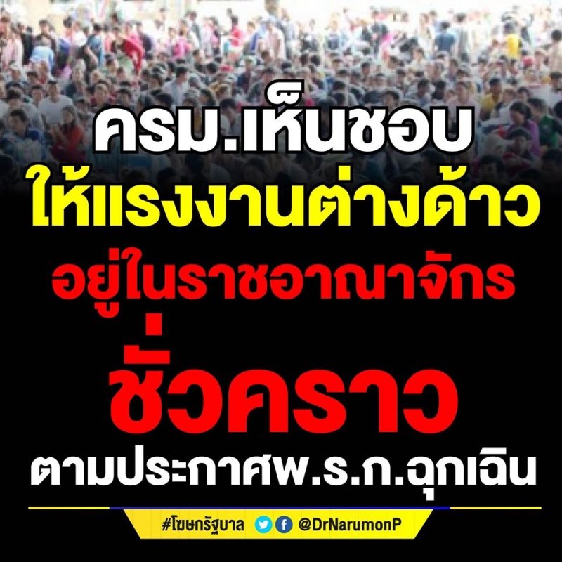 วันที่ 31 มีนาคม 63 ศาสตราจารย์นฤมล ภิญโญสินวัฒน์ โฆษกประจำสำนักนายกรัฐมนตรี เปิดเผยว่า คณะรัฐมนตรีมีมติเห็นชอบการผ่อนปรนการอยู่ในราชอาณาจักรเป็นการชั่วคราวและการทำงานให้กับแรงงานต่างด้าวที่เข้ามาทำงานตามข้อตกลงที่รัฐบาลไทยได้ลงนามกับรัฐบาลประเทศคู่ภาคี ทั้งนี้ มิให้นำมาตรา 12 (10) และมาตรา 54 แห่งพระราชบัญญัติคนเข้าเมือง พ ศ 2522 มาบังคับใช้แก่คนต่างด้าว โดยให้หน่วยงานที่เกี่ยวข้องดำเนินการตามที่กำหนด ตามที่กระทรวงแรงงานเสนอ