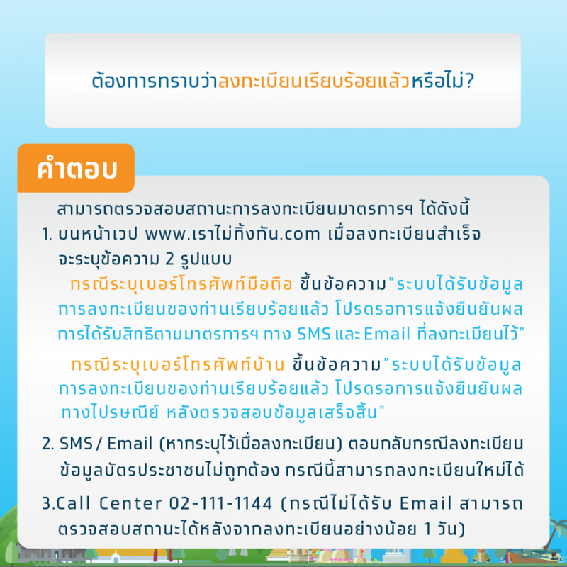 3 กดเบอร์ 02-111-1144 กรณีที่ไม่ได้รับอีเมล สามารถตรวจสอบสถานะหลังจากลงทะเบียน 1 วัน
