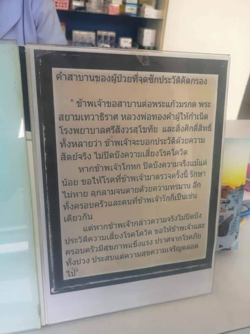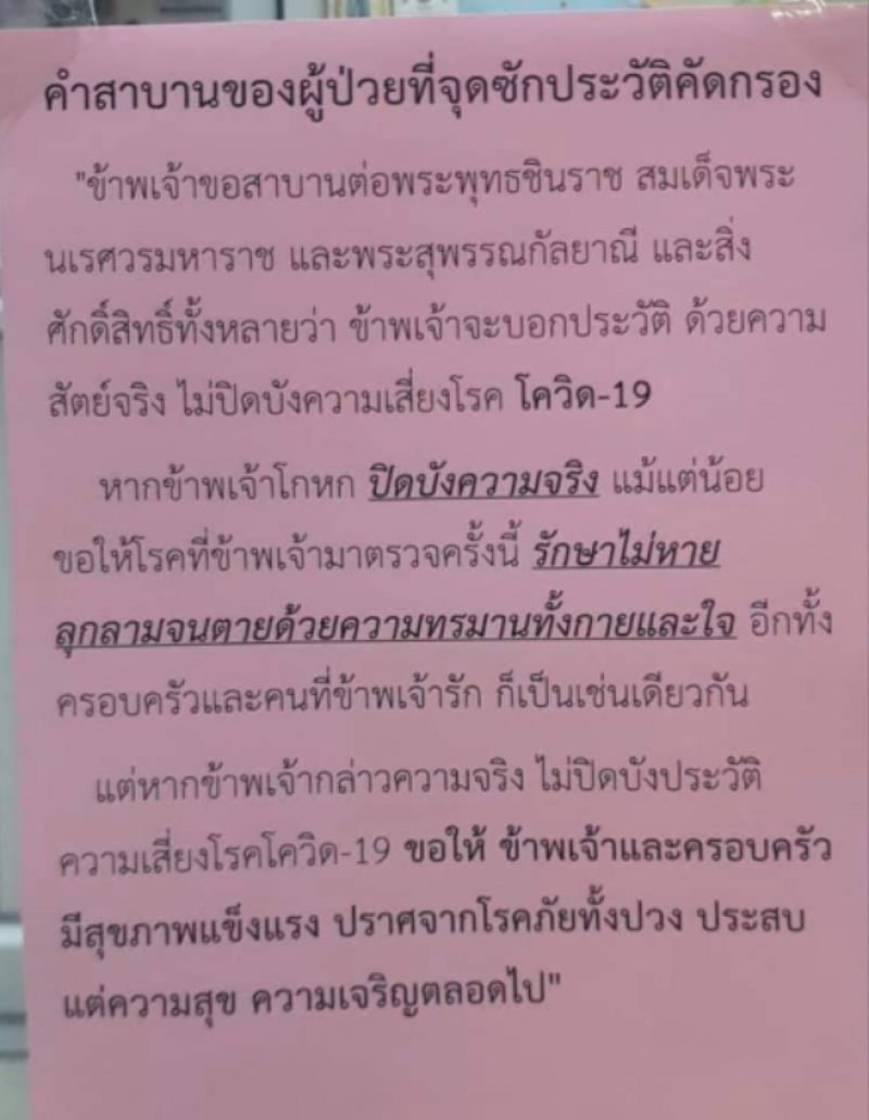 ข้าพเจ้าขอสาบานต่อพระพุทธชินราช สมเด็จพระนเรศวรมหาราช และพระสุพรรณกัลนาณี และสิ่งศักดิ์สิทธิ์ทั้งหลายว่า ข้าพเจ้าจะบอกประวัติ ด้วยความสัตย์จริง ไม่ปิดบังความเสี่ยงโรค โควิด-19 หากเข้าเจ้าโกหกปิดบังความจริงแม้แต่น้อย ขอให้โรคข้าพเจ้าที่มาตรวจครั้งนี้ รักษาไม่หาย ลุกลามจนตายด้วยความทรมานทั้งกายและใจ อีกทั้งครอบครัวและคนที่ข้าพเจ้ารัก ก็เป็นเช่นเดียวกัน