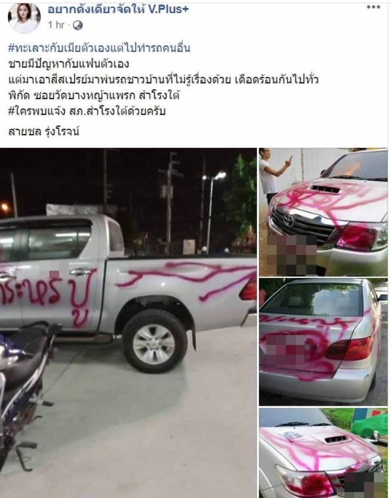 เป็นอีกหนึ่งเรื่องราวที่โซเชียลเข้ามาแสดงความเห็นกันเป็นจำนวนมาก หลังมีผู้ใช้เพจเฟสบุ๊คชื่อ อยากดังเดี๋ยวจัดให้ ได้ออกมาโพสต์ภาพ ของหนุ่มรายหนึ่งที่ได้ไปเจอภาพของรถยนต์ของผู้ที่ต้องเจอกับคราวเคราะห์เเบบไม่รู้อิโหน่อิเหน่ เห็นเเล้วสงสารเเทน เพราะมีคู่รักทะเลาะกัน ทำฝ่ายชายโมโห ทำแฟนไม่ได้ เลยไปลงกับรถคนอื่น โดยเอาสีพ่นเป็นตัวอักษรที่ใครเห็นก็ต่างรับไม่ได้