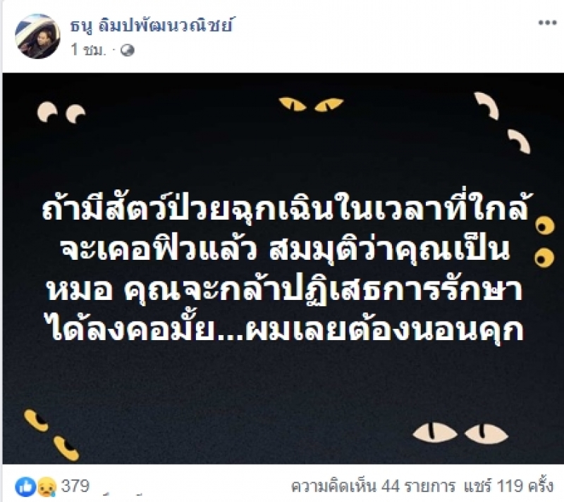 เรียกได้ว่าเป็นอีกหนึ่งเรื่องราวที่โซเชียลเข้ามาแสดงความเห็นกันเป็นจำนวนมาก หลังมีผู้ใช้เฟสบุ๊ครายหนึ่งได้ออกมาโพสต์เรื่องราวโดยได้ระบุข้อความว่า ถ้ามีสัตว์ฉุกเฉินในเวลาที่ใกล้จะเคอร์ฟิวแล้ว สมมุติว่าคุณเป็นหมอ คุณจะกล้าปฏิเสธการรักษาได้ลงคอมั้ย ผมเลยต้องนอนห้องขัง