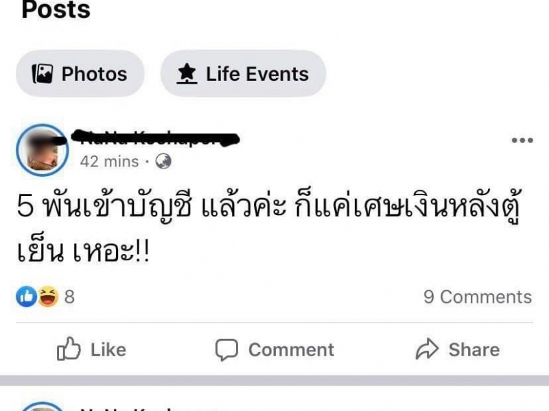 จากกรณีสาวคนหนึ่งได้โพสต์ลงเฟซบุ๊กว่าตนเองได้เงิน 5 พันบาทจากรัฐแล้วพร้อมระบุว่า 5 พันเข้าบัญชีแล้วค่ะ ก็แค่เศษเงินหลังตู้เย็น เหอะ ซึ่งดูจากการใช้ชีวิตในเฟซบุ๊กแล้วนั้นหญิงดังกล่าวค่อนข้างมีฐานะใช้ชีวิตหรูหราไม่ได้เดือดร้อนเรื่องเงินเลยแม้แต่น้อย เลยเกิดข้อสงสัยต่อชาวเน็ตว่า นี่คือสิ่งที่รัฐบาลเลือกให้ผ่านเกณฑ์แล้วนั้นหรอ