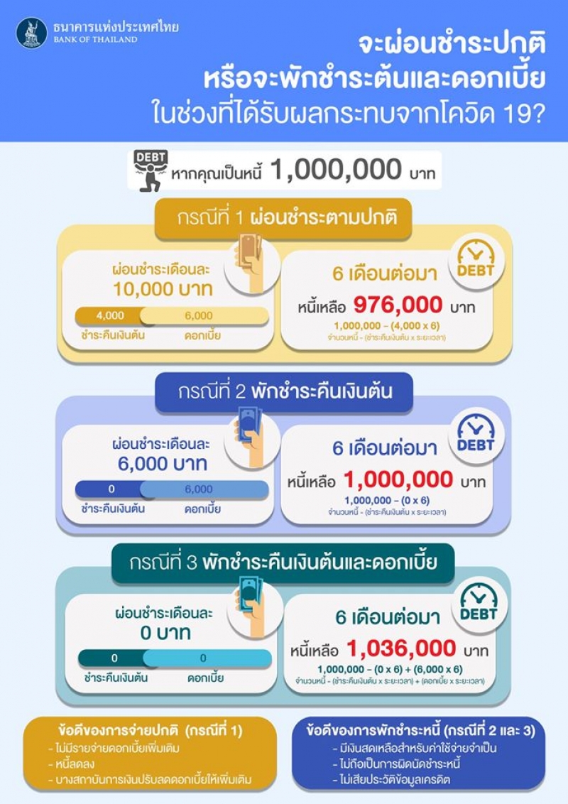 กรณีแรก ผ่อนชำระตามปรกติ สมมติว่า หากคุณเป็นหนี้บ้าน 1,000,000 บาท และมีงวดชำระหนี้จากการกู้ซื้อบ้านเดือนละ 10,000 บาท ซึ่งประกอบด้วย เงินต้น 4,000 บาท และดอกเบี้ย 6,000 บาท เรายังจ่ายชำระหนี้ตามปกติ เดือนละ 10,000 บาท เหมือนเดิม ก็จะช่วยลดเงินต้น ผ่านไป 6 เดือน ยอดหนี้ก็จะเหลือแค่ 976,000 บาท ดังนั้น หากใครเป็นหนี้และได้รับผลกระทบ สามารถติดต่อธนาคารเจ้าหนี้เพื่อขอรับความช่วยเหลือได้ ซึ่งจะทำให้เรายังไม่ต้องจ่ายหนี้ตามสัญญา โดยไม่ถือว่าผิดนัดชำระหนี้ และไม่เสียประวัติ