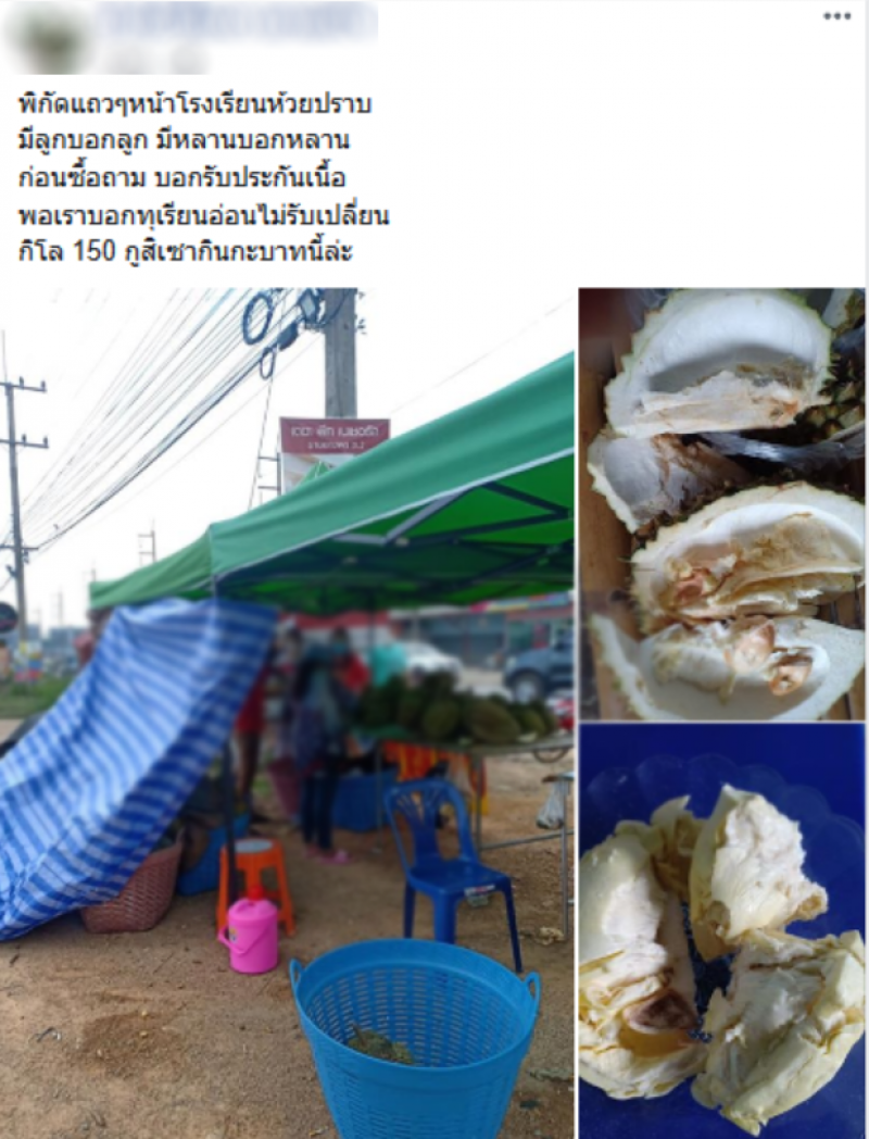 วันที่ 11 เมษายน ผู้ใช้เฟซบุ๊กท่านหนึ่ง ได้มีการโพสต์ภาพทุเรียนที่ซื้อมาจากร้านแห่งหนึ่ง กิโลกรัมละ 150 บาท แต่เมื่อเอากลับถึงบ้านก็พบว่าทุเรียนยังไม่สุก รับประทานไม่ได้ พอจะเอาไปคืนแม่ค้าก็ไม่เปลี่ยนให้ ทั้งที่ก่อนหน้านี้แม่ค้าบอกว่ารับประกันทุเรียน จึงได้โพสต์ลงโซเชียลเพื่อเตือน หากใครจะไปซื้อทุเรียนต้องระวังให้ดี