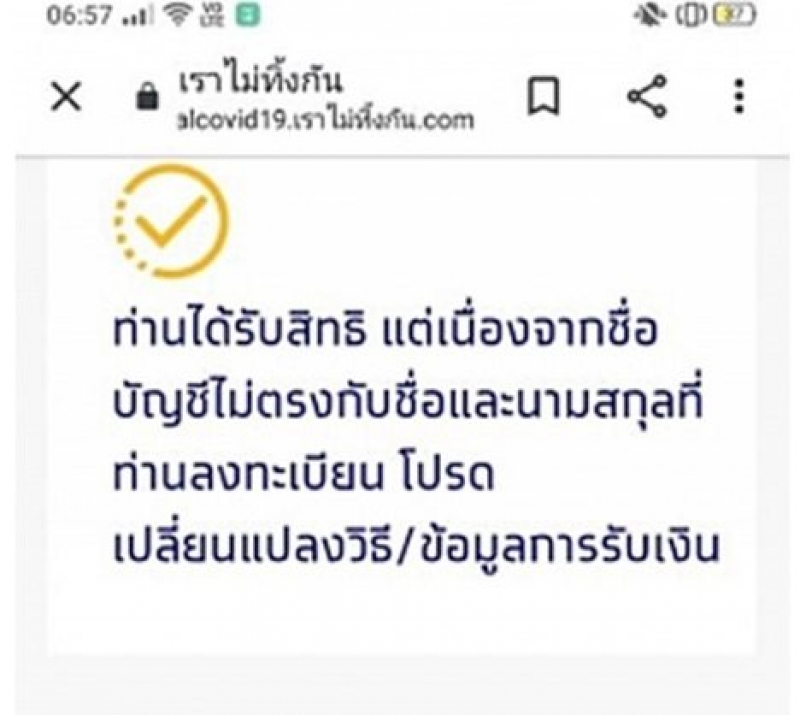 แต่สำหรับสถานะ ท่านได้รับสิทธิ แต่บัญชีชื่อไม่ตรงกับชื่อและที่สกุลที่ท่านลงทะเบียน โปรดเปลี่ยนแปลงวิธีข้อมูลการรับเงิน สาเหตุเกิดจากกรอกเลขบัญชีผิด ทำให้ชื่อบัญชีที่ปรากฏ ไม่ตรงกับชื่อที่ลงทะเบียน