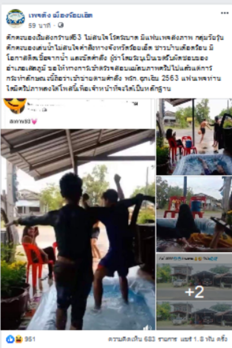 คึกคะนองเริ่มสงกรานต์63 ไม่สนใจcovid19 มีแฟนเพจส่งภาพ กลุ่มวัยรุ่นคึกคะนองเล่นน้ำไม่สนใจคำสั่งทางจังหวัดร้อยเอ็ด ชาวบ้านเดือดร้อน มีโอกาสติดcovid19จากน้ำ และขัดคำสั่ง ผู้ว่าโดยระบุเป็นเขตรับผิดชอบของอำเภอเสลภูมิ