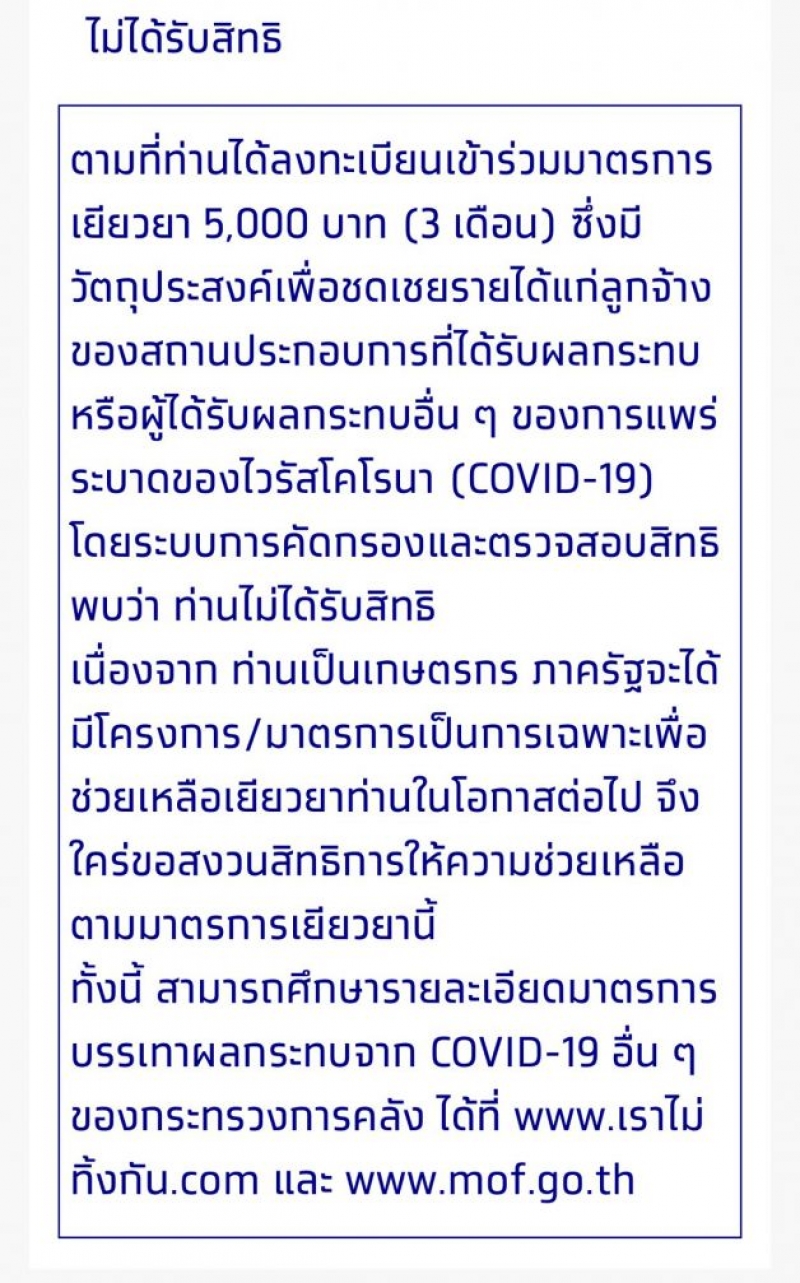เรียกได้ว่ากลายเป็นกระแส ที่ถูกพูดถึงอย่างมากในขณะนี้ หลังจากที่หลายคนได้รับข้อความยืนยัน ไม่ได้รับสิทธิ์ ช่วยเหลือ 5000 บาท จากกระทรวงการคลัง โดยส่วนใหญ่พบระบุเหตุผลว่า เป็นเกษตรกร และเป็นนักศึกษา ซึ่งยืนยันว่าไม่ตรงกับข้อมูลของผู้ลงทะเบียน