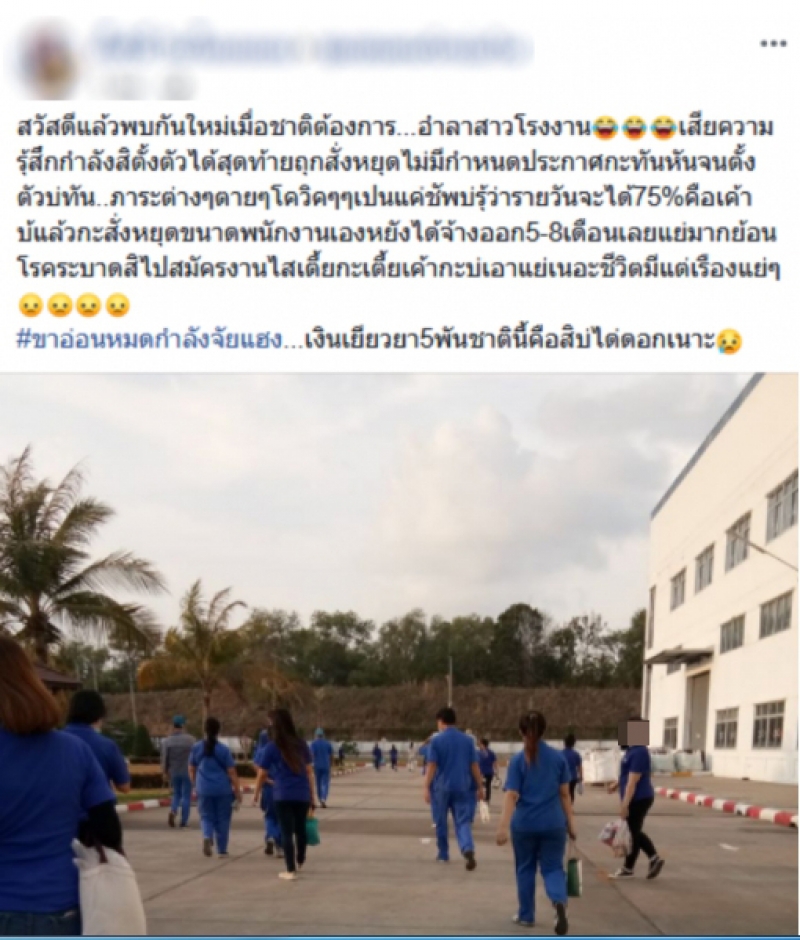 โดยสาวโรงงานคนนี้ระบุว่า สวัสดีแล้วพบกันใหม่เมื่อชาติต้องการ อำลาสาวโรงงาน เสียความรู้สึกกำลังสิตั้งตัวได้สุดท้ายถูกสั่งหยุดไม่มีกำหนดประกาศกะทันหันจนตั้งตัวบ่มัน ภาระต่างๆ covid-19 เป็นแค่ชัพบ่รู้ว่ารายวันจะได้75%คือเขาบ่แล้วกะสั่งหยุดขนาดพนักงานเองหยังได้จ้างออก5-8เดือนเลยแย่มากย้อนcovid-19สิไปสมัครงานไสเตี้ยกะเตี้ยเค้ากะบ่เอาแย่เนอะชีวิตมีแต่เรื่องแย่ๆ