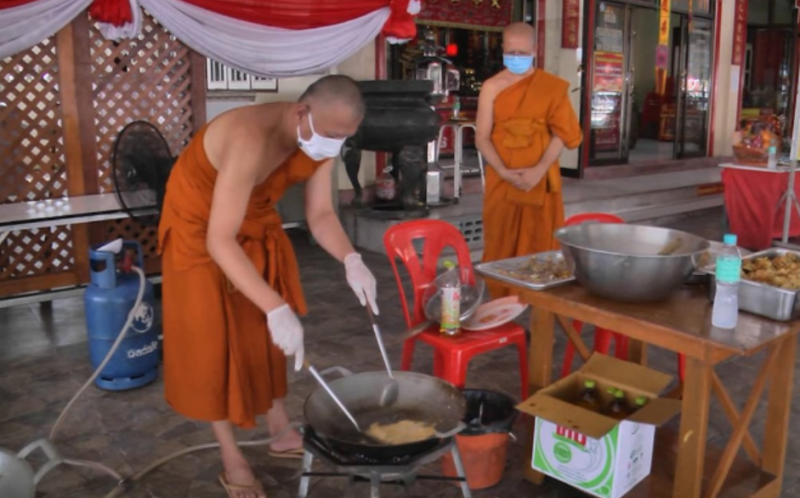 พระมหาปกรณ์ ฐานฺตฺโม อายุ 48 ปี ผู้ช่วยเจ้าอาวาสวัดพนัญเชิงวริวหาร บอกว่า ในช่วงนี้ชาวบ้านประสบปัญหา ทำให้ขาดรายได้ ทางพระธรรมรัตนมงคล เจ้าคณะจังหวัด จึงได้ให้พระสงฆ์และคนงานของวัดช่วยกัน หุงข้าว ประกอบอาหาร แบบปรุงสำเร็จ ไปแจกจ่ายให้กับญาติโยม ตามบ้านที่อยู่ใกล้กับวัดถึงหน้าบ้าน โดยไม่ต้องมารวมตัวกัน