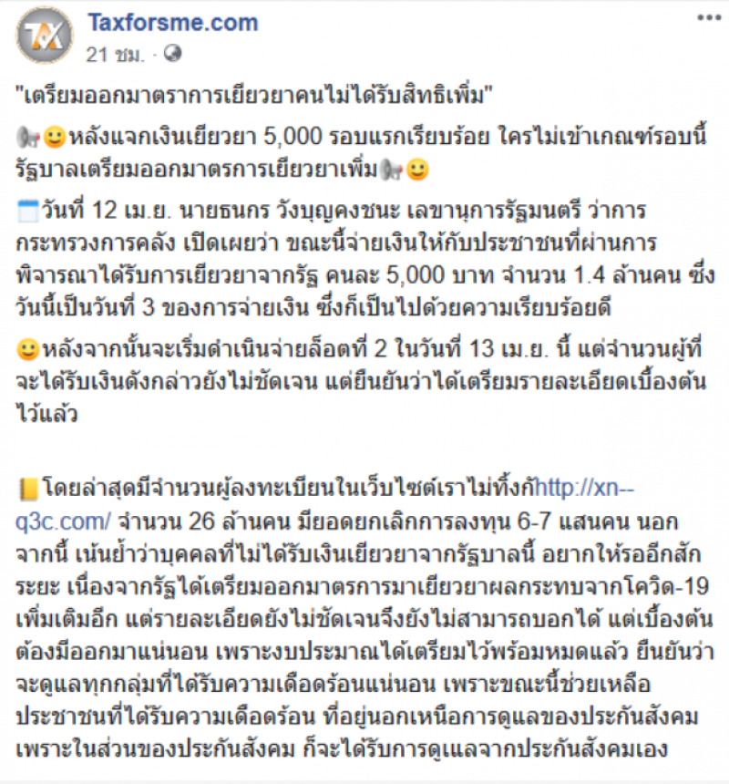 ล่าสุด ทาง FACEBOOK Taxfors.com ก็ได้ออกมาโพสต์ถึงผู้ที่ไม่ได้รับเงินจากรัฐบาลจำนวน 5000 บาท จากโครงการ เราไม่ทิ้งกัน โดยระบุว่า เตรียมออกมาตราการเยียวยาคนที่ไม่ได้รับสิทธิเพิ่ม