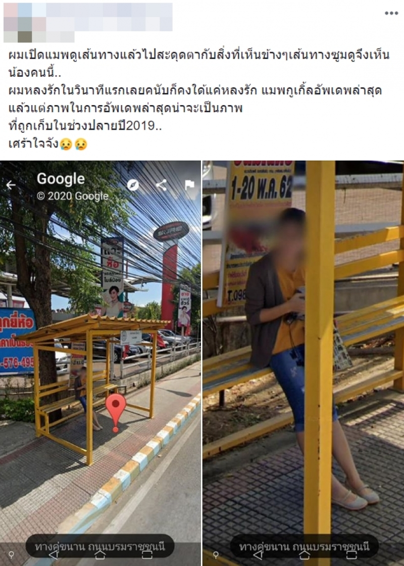 เรียกได้ว่าเป้นอีกหนึ่งเรื่องราวที่โซเชียลเข้ามาแสดงความเห็นเยอะมากๆ หลังหนุ่มรายหนึ่งโพสต์เล่าเหตุการณ์หลังจากเปิดแผนที่ดูเส้นทางในแอพพลิเคชั่น Google Maps ก่อนจะไปสะดุดตาเข้าอย่างจังกับสิ่งที่เห็นข้างทาง เมื่อไปพบกับหญิงสาวรายหนึ่งขณะนั่งกำลังรอรถประจำทาง ทำเอาหนุ่มผู้โพสต์ถึงกับยอมรับเต็มปากเต็มคำว่า แอบหลงรักสาวคนดังกล่าวตั้งแต่แรกเห็น