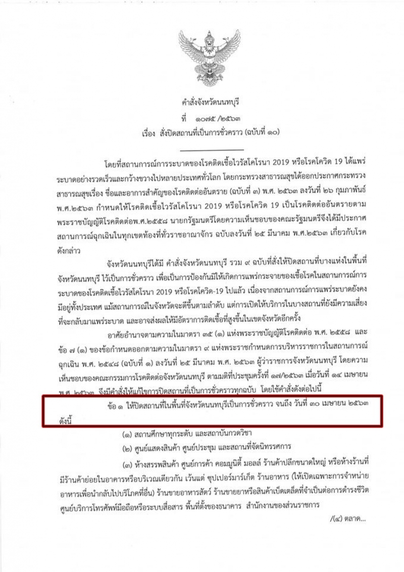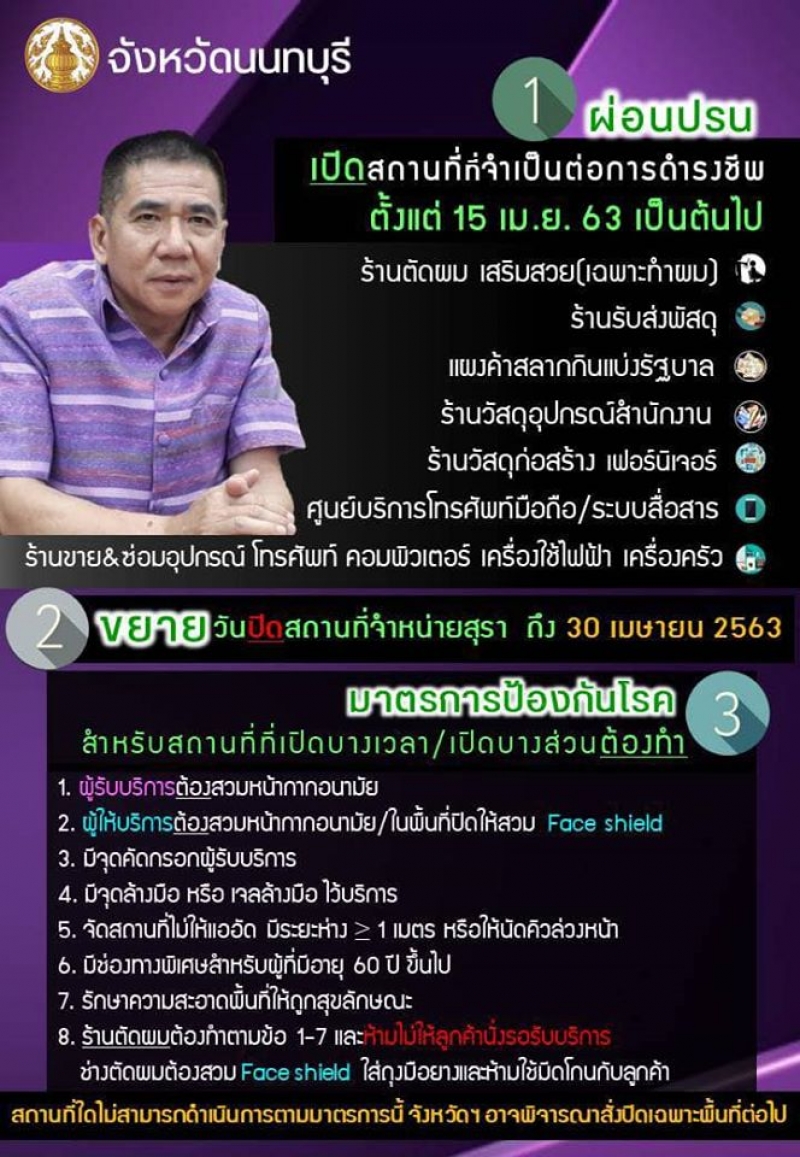 ก่อนหน้านั้น ผู้ว่าฯนนทบุรี ได้มีคำสั่งจังหวัดนนทบุรี ที่ 1072/2563 เรื่อง สังปิดสถานที่เป็นการชั่วคราว ฉบับที่ 9 มีใจความสำคัญว่าด้วย การผ่อนปรนให้เปิดสถานที่บางแห่ง ซึ่งจำเป็นต่อการดำรงชีวิต โดยเริ่มมีผลตั้งแต่ 15 เม.ย.เป็นต้นไป อาทิ ร้านตัดผม ร้านรับส่งพัสดุ แผงค้าสลาก ร้านอุปกรณ์สำนักงาน วัสดุก่อสร้าง เฟอร์นิเจอร์ เครื่องใช้ไฟฟ้า ร้านมือถือ และคอมพิวเตอร์ ฯลฯ พร้อมกับขยายเวลาการปิดสถานที่เป็นการชั่วคราวจนถึงวันที่ 30 เมย 2563