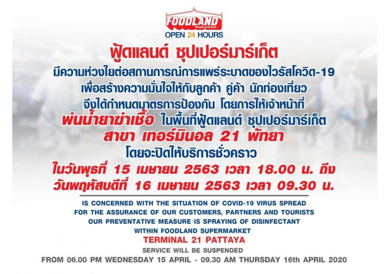 ในเพจ Foodland Supermarket โพสต์ข้อความระบุว่า บริษัท ฟู้ดแลนด์ ซุปเปอร์มาร์เก็ต จำกัดมีความห่วงใยต่อสถานการณ์การแพร่ของ covid-19 จากกรณีที่ได้มีการแชร์ข้อมูลในโลกออนไลน์เกี่ยวกับผู้ติดcovid-19ที่ได้เดินทางไปยัง ฟู้ดแลนด์ฯ สาขา เทอร์มินอล 21 พัทยา ในวันที่ 5 เมษายน 2563เพื่อสร้างความมั่นใจให้กับลูกค้า คู่ค้า นักท่องเที่ยว และพนักงาน จึงได้กำหนดมาตรการป้องกัน โดยการให้เจ้าหน้าที่ทำความสะอาด ในพื้นที่ฟู้ดแลนด์ ซุปเปอร์มาร์เก็ต สาขา เทอร์มินอล 21 พัทยา โดยจะปิดให้บริการชั่วคราวในวันพุธ ที่ 15 เมษายน เวลา 18.00 น. วันพฤหัสบดี ที่ 16 เมษายน 2563 เวลา 09.30 น.และจะเปิดให้บริการปกติในวันพฤหัสบดีที่ 16 เมษายน 2563 เวลา 9.30 น.ด้วยความห่วงใยทุกท่านค่ะ