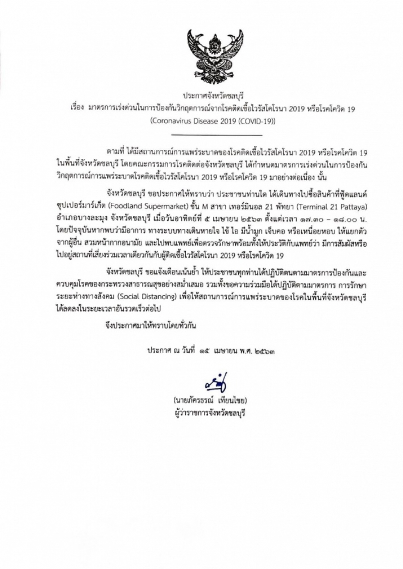ด้าน จังหวัดชลบุรี ขอประกาศให้ทราบว่า ประชาชนท่านใด ได้เดินทางไปซื้อสินค้าที่พูดแลนด์ ซุปเปอร์มาร์เก็ต Foodland Supermarket ชั้น M สาขา เทอร์มินอล 21 พัทยา Terminal 21 Pattaya อําเภอบางละมุง จังหวัดชลบุรี เมื่อวันอาทิตย์ที่ ๕ เมษายน ๒๕๖๓ ตั้งแต่เวลา ๑๗.๓๐ ๑๘.00 น. โดยปัจจุบันหากพบว่ามีอาการให้แยกตัว จากผู้อื่น สวมหน้ากากอนามัย และไปพบแพทย์เพื่อตรวจรักษาพร้อมทั้งให้ประวัติกับแพทย์ว่า มีการสัมผัสหรือ ไปอยู่สถานที่เสี่ยงร่วมเวลาเดียวกันกับผู้ติด covid-19