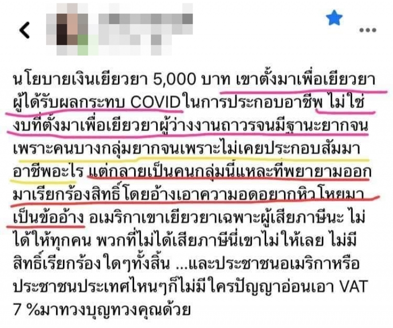 กลายเป็นประเด็นที่ชาวเน็ตเข้ามาแสดงความเห็นวิจารณ์กันอย่างยับเยิน เมื่อสาวผู้ใช้เฟซบุ๊กรายหนึ่งโพสต์ข้อความระบุว่า นโยบายเงินช่วยเหลือ 5,000 บาท เขาตั้งมาเพื่อช่วยเหลือ ผู้ได้รับผลกระทบ COVIDในการประกอบอาชีพ ไม่ใช่งบที่ตั้งมาเพื่อช่วยเหลือผู้ว่างงานถาวรจนมีฐานะจน เพราะคนบางกลุ่มจนเพราะไม่เคยประกอบสัมมาอาชีพอะไร