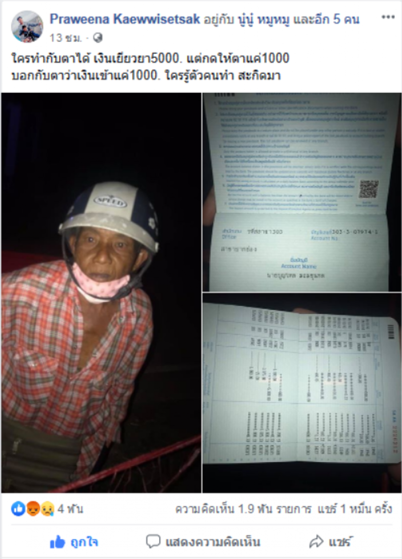 จากกรณีมี่ผู้ใช้เฟสบุ๊คชื่อ Praweena Kaewwisetsak ได้ออกมาโพสต์ภาพคุณตาท่านสหนึ่ง พร้อมทั้งได้ระบุข้อความว่า ใครทำกับตาได้ เงินช่วยเหลือ 5000 แต่กดให้ตาแค่1000 บอกกับตาว่าเงินเข้าแค่1000 ใครรู้ตัวคนทำ สะกิดมา