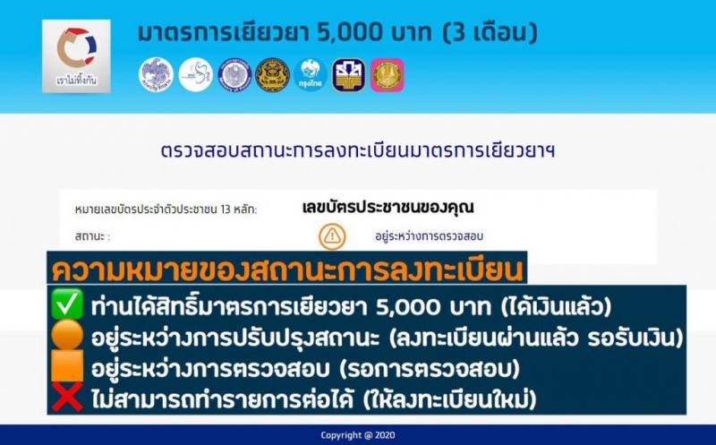 อย่างไรก็ดี ระบบจะแจ้งผลการตรวจสอบสิทธิ์ผ่านทาง SMS ไปยังเบอร์โทรศัพท์มือถือและอีเมลที่ท่านลงทะเบียนโดยเร็วที่สุด หรือสามารถตรวจสอบสถานะการลงทะเบียนของท่านได้ที่ www.เราไม่ทิ้งกัน.com