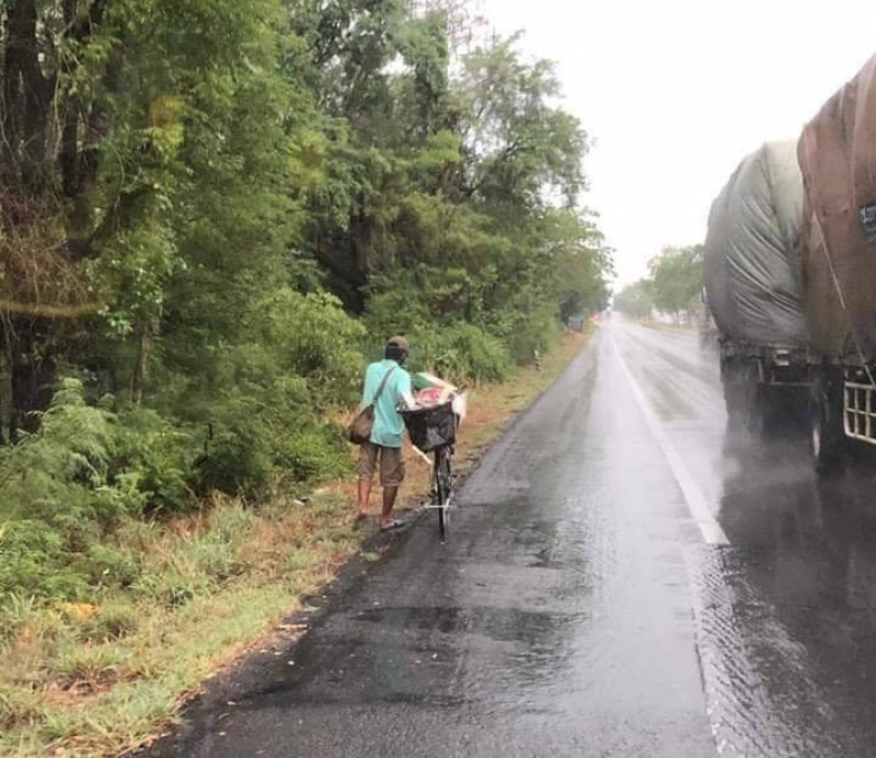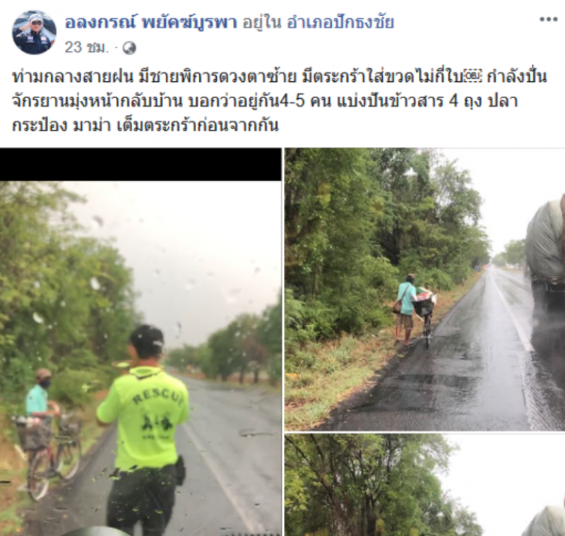 หนุ่มพลเมืองดีได้โพสต์ว่า ท่ามกลางสายฝน มีชายพิการดวงตาซ้าย มีตระกร้าใส่ขวดไม่กี่ใบ กำลังปั่นจักรยานมุ่งหน้ากลับบ้าน บอกว่าอยู่กัน 4-5 คน แบ่งปันข้าวสาร 4 ถุง ปลากระป๋อง มาม่า เต็มตระกร้าก่อนจากกัน