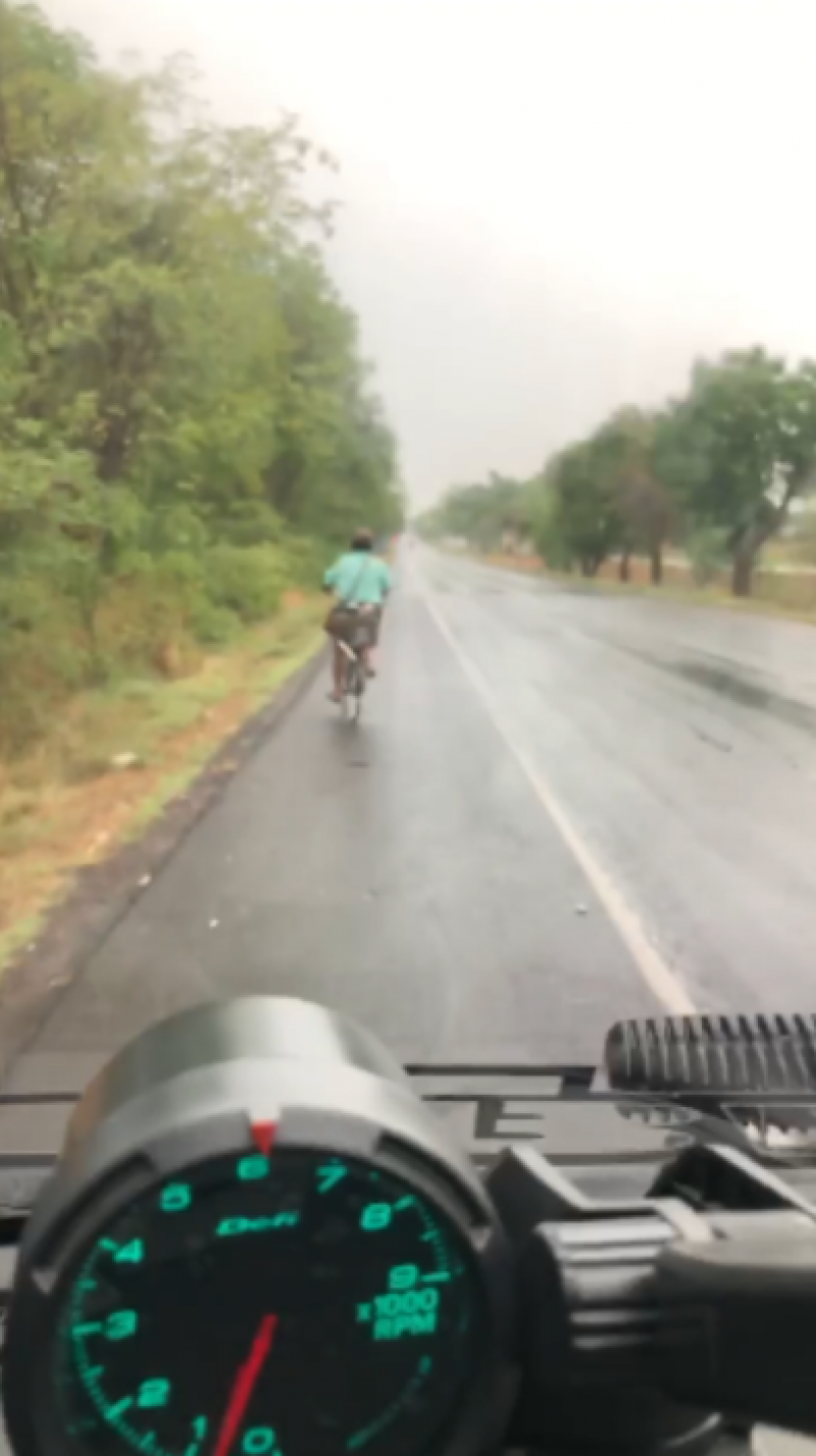 หนุ่มเห็นชายปั่นจักรยาน ท่ามกลางสายฝน