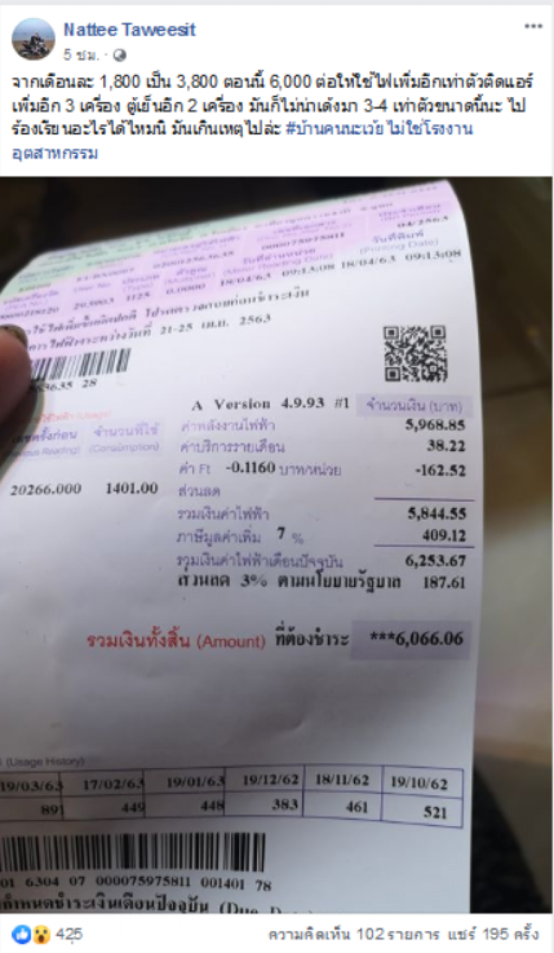 หนุ่มโพสต์ลงโซเชียลทันที หลังเห็นบิลค่าไฟที่บ้าน ลั่น บ้านคนนะเว้ยไม่ใช่โรงงาน