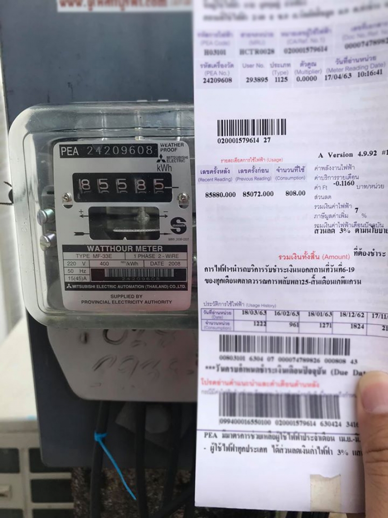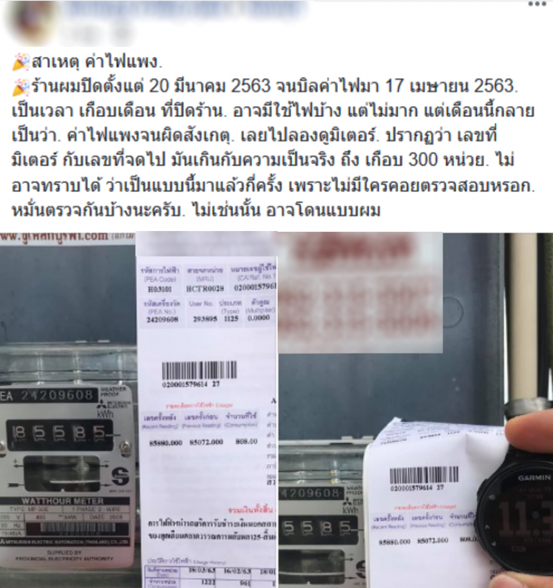 โดยผู้โพสต์ได้ระบุว่า สาเหตุ ค่าไฟแพง ร้านผมปิดตั้งแต่ 20 มีนาคม 2563 จนบิลค่าไฟมา 17 เมษายน 2563 เป็นเวลา เกือบเดือน ที่ปิดร้าน อาจมีใช้ไฟบ้าง แต่ไม่มาก แต่เดือนนี้กลายเป็นว่า ค่าไฟแพงจนผิดสังเกตุ เลยไปลองดูมิเตอร์ ปรากฏว่า เลขที่มิเตอร์ กับเลขที่จดไป มันเกินกับความเป็นจริง ถึง เกือบ 300 หน่วย ไม่อาจทราบได้ ว่าเป็นแบบนี้มาแล้วกี่ครั้ง เพราะไม่มีใครคอยตรวจสอบหรอก หมั่นตรวจกันบ้างนะครับ ไม่เช่นนั้น อาจโดนแบบผม
