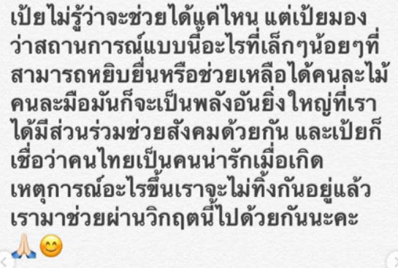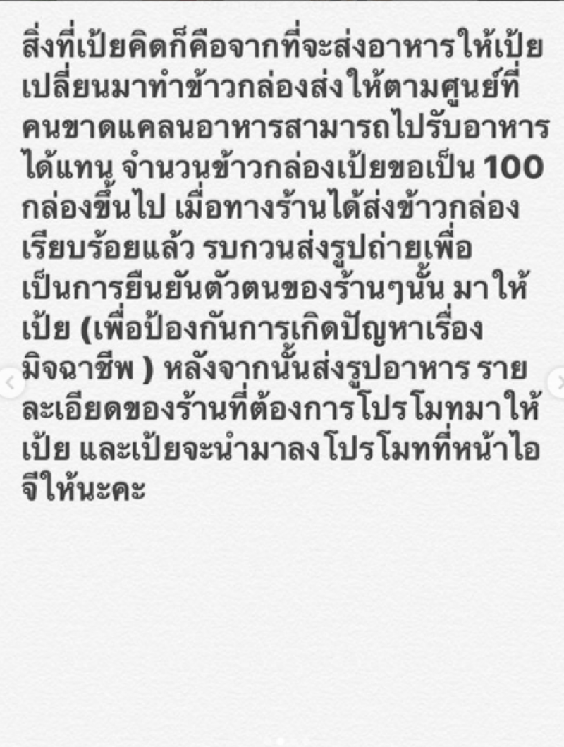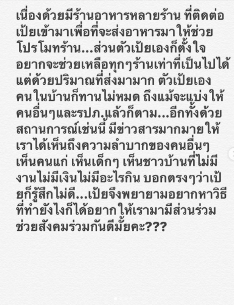 แต่ไม่ว่าอย่างไร ที่สาวเป้ย ปานวาด ที่ได้ออกมาโพสต์ลงในไอจีส่วนตัวสำหรับคนที่อยากให้โปรโมทร้าน โดยการเอาอาหารไปแจกให้ผู้ที่ได้รับผลกระทบโดยตรง ซึ่งเป็นไอเดียที่ดีมากๆเลยทีเดียว