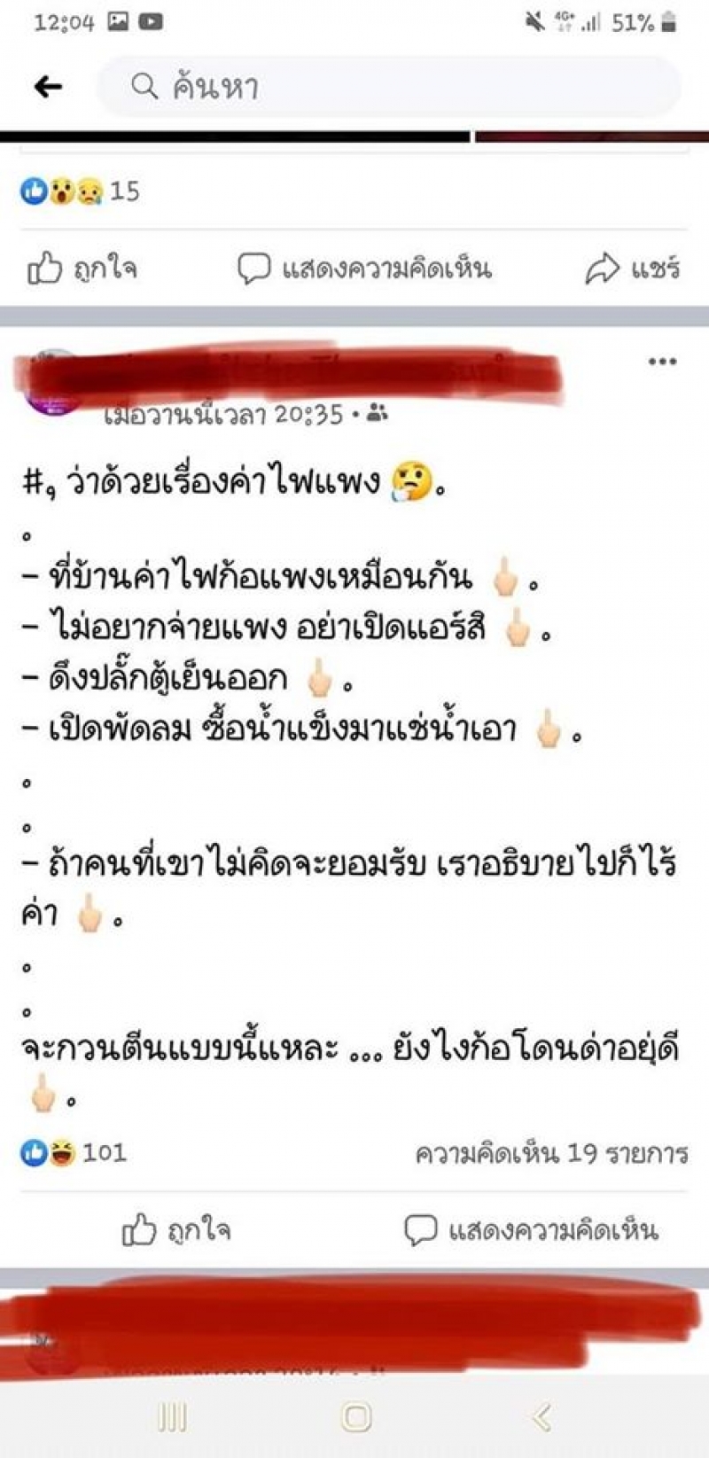 ที่โพสต์ข้อความตำหนิประชาชนที่ออกมาโวยเรื่องค่าไฟแพง ไม่ว่าจะเป็น ไปผลิตไฟใช้กันเองเลยจ่ะ จะได้ไม่ต้องมาว่ากันอีก ไปจ่ะๆ หรือ คนไทยเห็นแก่ได้เยอะมากจริงๆ