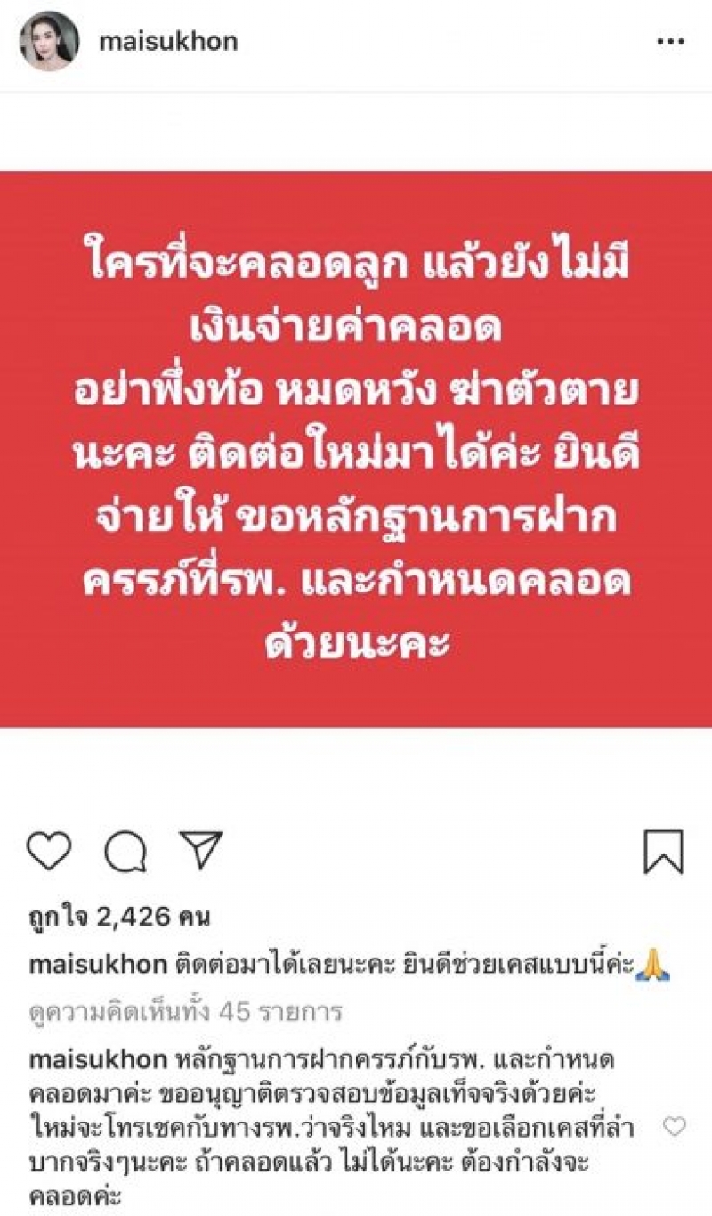 ใหม่ สุคนธวา โพสต์ข้อความว่า ใครที่จกำเนิดบุตร แล้วยังไม่มีเงินจ่ายค่าโรงบาล อย่าพึ่งท้อ หมดหวัง ติดต่อใหม่มาได้ค่ะ ยินดีจ่ายให้ ขอหลักฐานการฝากกำเนินที่รพ และกำหนดออกด้วยนะคะ ติดต่อมาได้เลยนะคะ ยินดีช่วยเคสแบบนี้ค่ะ