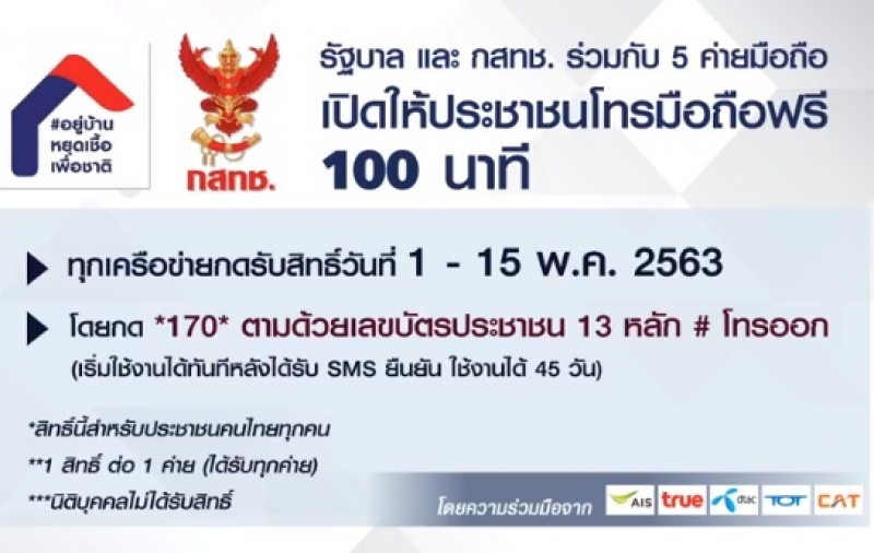 เรียกได้ว่าช่วงนี้นั้น หลายๆคนประสบปัญหาในช่วง colvid-19 โดยภาครัฐก็ได้ออกมาช่วยเหลือหลายๆด้าน ล่าสุด นายฐากร ตัณฑสิทธิ์ เลขาธิการคณะกรรมการกิจการกระจายเสียง กิจการโทรทัศน์ และกิจการโทรคมนาคมแห่งชาติ กสทช. เปิดเผยว่า ที่ประชุมร่วมระหว่าง กสทช. กับผู้ให้บริการโทรศัพท์เคลื่อนที่ทั้ง 5 ราย ได้แก่ เอไอเอส ทรู ดีแทค ทีโอที และ บมจ. กสท โทรคมนาคม แคท ได้ข้อสรุปว่า เพื่อเป็นการแบ่งเบาภาระประชาชนในช่วง covid-19 ผู้ให้บริการทุกรายจะให้สิทธิ์ โทร.ฟรี 100 นาที ทุกเครือข่าย 45 วัน