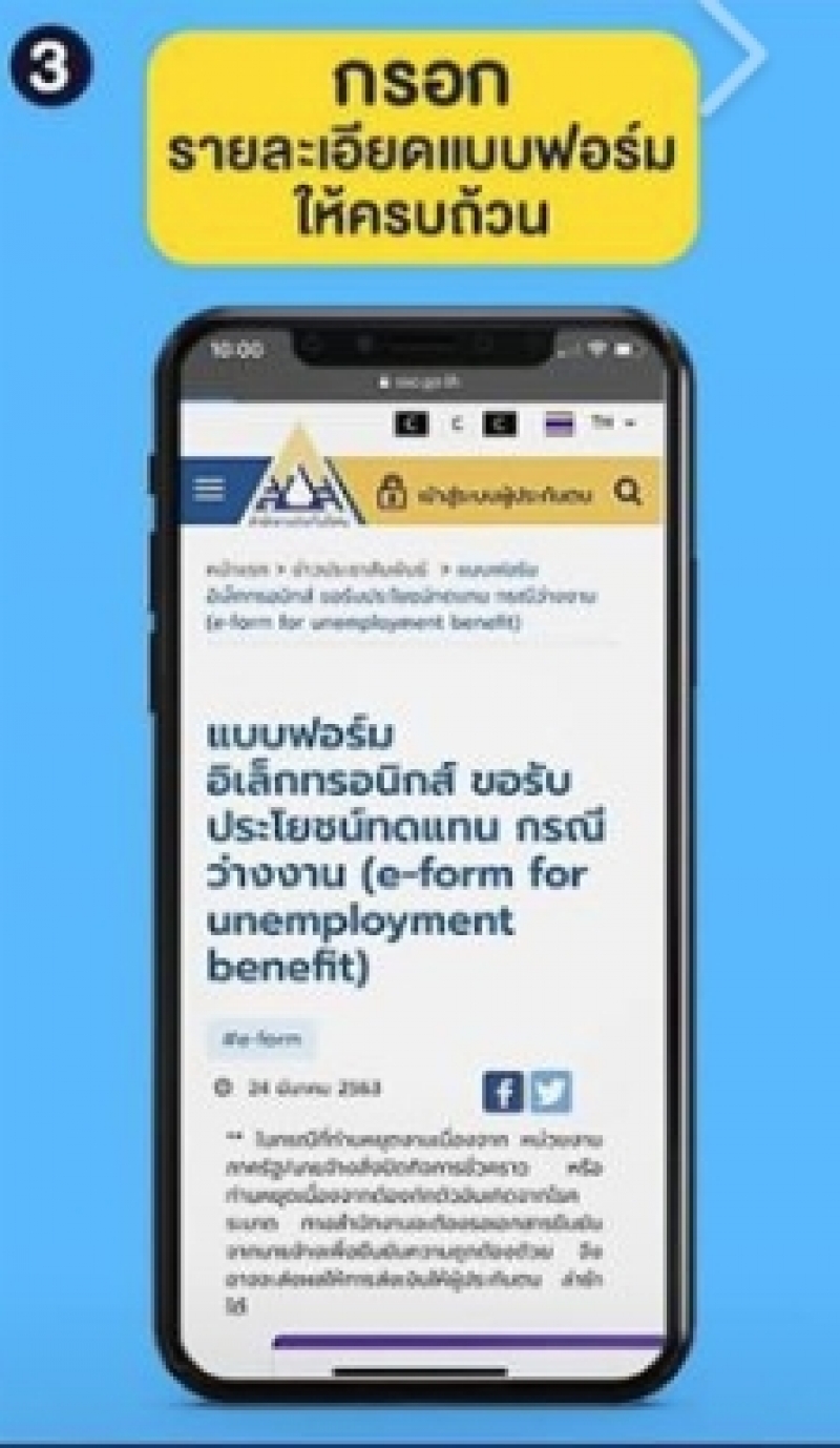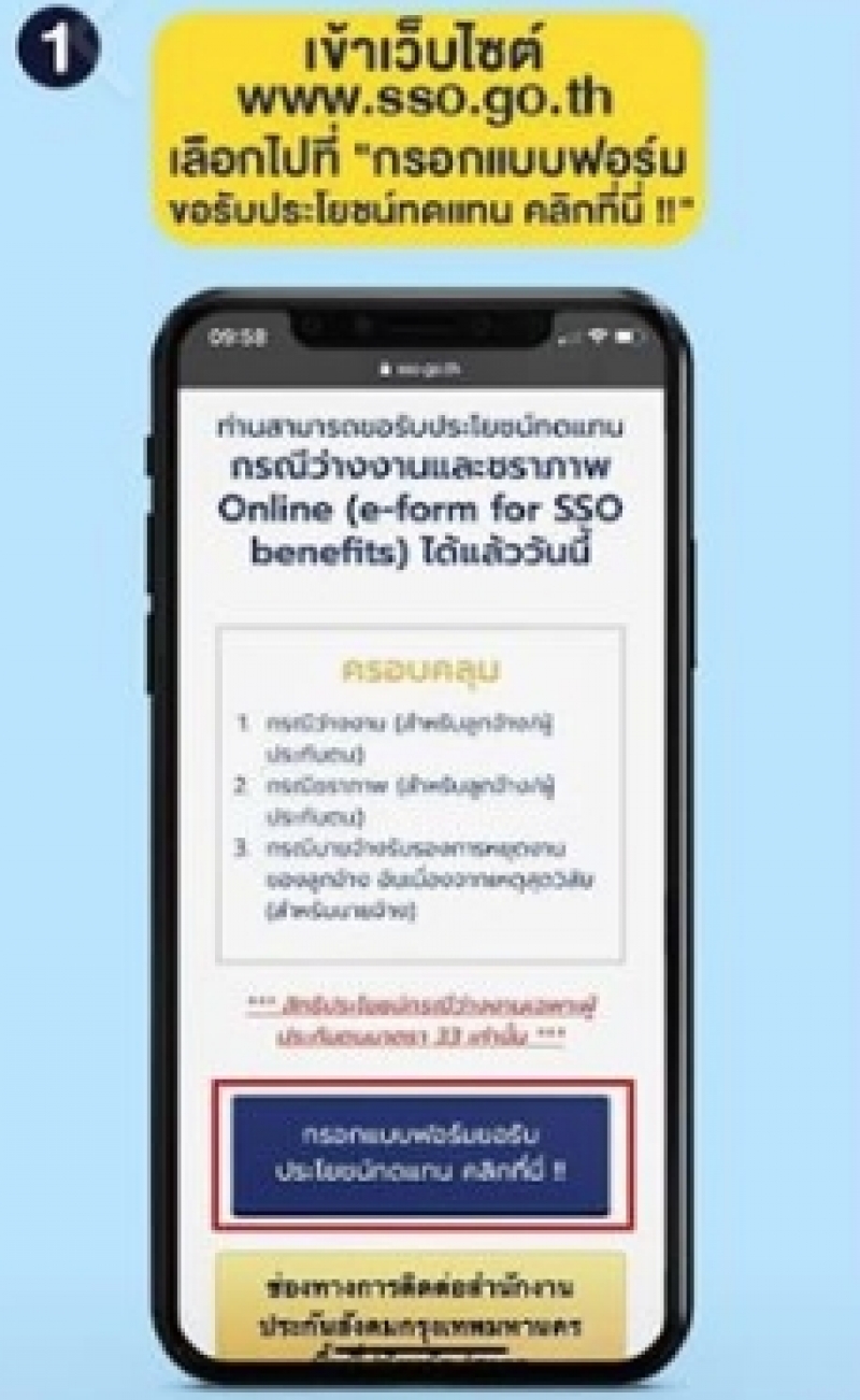 1.เว็บไซต์ www.sso.go.th เลือกไปที่ กรอกแบบฟอร์มขอรับประโยชน์ทดแทน คลิกที่นี่
