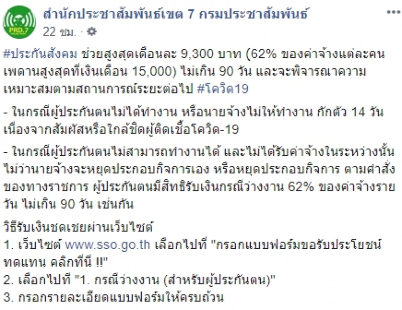 ประกันสังคม ช่วยสูงสุดเดือนละ 9,300 บาท 62% ของค่าจ้างแต่ละคน เพดานสูงสุดที่เงินเดือน 15,000 ไม่เกิน 90 วัน และจะพิจารณาความเหมาะสมตามสถานการณ์ระยะต่อไป #โควิด19 ในกรณีผู้ประกันตนไม่ได้ทำงาน หรือนายจ้างไม่ให้ทำงาน กักตัว 14 วัน เนื่องจากสัมผัสหรือใกล้ชิดผู้ติด covid-19