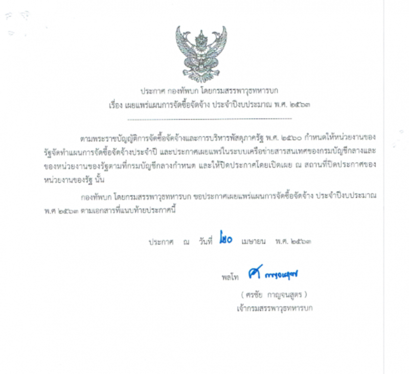 ซึ่งพบว่า เมื่อวันที่ 20 เมษายน มีประกาศ กองทัพบก โดยกรมสรรพาวุธทหารบก เรื่อง เผยแพร่แผนการจัดซื้อจัดจ้าง ประจำปีงบประมาณ พ.ศ. 2563