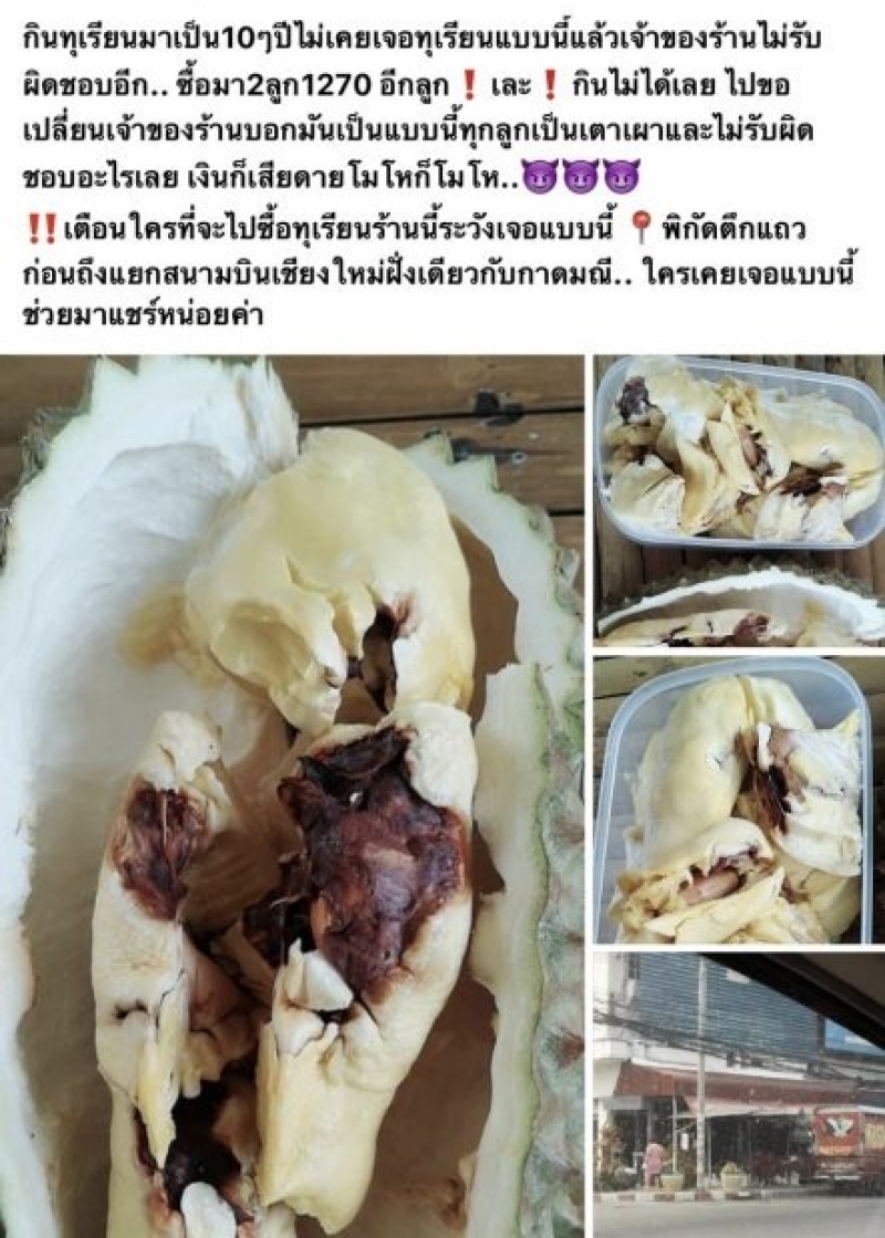 เรียกได้ว่าเป้นอีกหนึ่งเรื่องราวที่โซเชี้ยลเข้ามาแสดงความเห็น และให้ความสนใจกันเป็นจำนวนมาก หลัง มีสาวรายหนึ่งได้ออกมาโพสต์ภาพทุเรียนที่ซื้อมาบริเวณ อ.เมืองเชียงใหม่ พร้อมระบุข้อความว่า กินทุเรียนมาเป็น 10 ปี ไม่เคยเจอทุเรียนแบบนี้ แล้วเจ้าของร้านไม่รับผิดชอบอีก ซื้อมา 2 ลูก 1270 อีกลูกเละกินไม่ได้เลย ไปขอเปลี่ยนเจ้าของร้านบอกมันเป็นแบบนี้ทุกลูก เป็นเตาเผาและไม่รับผิดชอบอะไรเลย เงินก็เสียดายโมโหก็โมโห เตือนใครที่จะไปซื้อทุเรียนระวังเจอแบบนี้