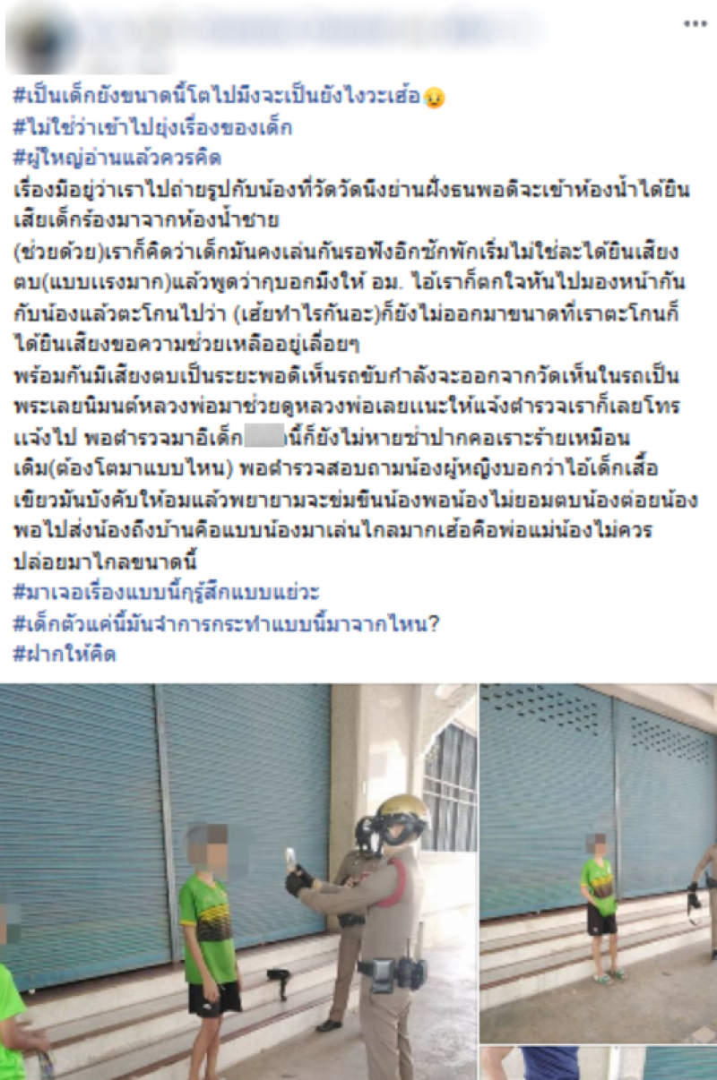 เรื่องมีอยู่ว่าเราไปถ่ายรูปกับน้องที่วัดวัดนึงย่านฝั่งธนพอดีจะเข้าห้องน้ำได้ยินเสียเด็กร้องมาจากห้องน้ำชาย (ช่วยด้วย)เราก็คิดว่าเด็กมันคงเล่นกันรอฟังอีกซักพักเริ่มไม่ใช่ละได้ยินเสียงตบ(แบบเเรงมาก)แล้วพูดว่ากุบอกมึงให้ อม. ไอ้เราก็ตกใจหันไปมองหน้ากันกับน้องแล้วตะโกนไปว่า (เฮ้ยทำไรกันอะ)ก็ยังไม่ออกมาขนาดที่เราตะโกนก็ได้ยินเสียงขอความช่วยเหลืออยู่เลื่อยๆ พร้อมกันมีเสียงตบเป็นระยะพอดีเห็นรถขับกำลังจะออกจากวัด เห็นในรถเป็นพระเลยนิมนต์หลวงพ่อมาช่วยดูหลวงพ่อเลยเเนะให้แจ้งตำรวจเราก็เลยโทรเเจ้งไป