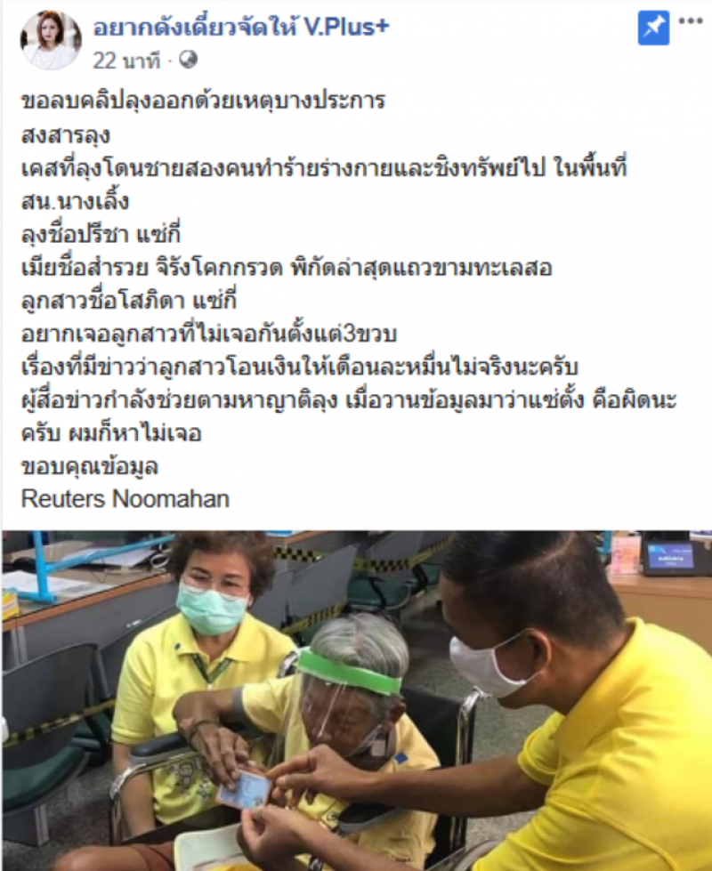 ล่าสุดทางเพจ อยากดังเดี๋ยวจัดให้ V Plus+ ได้มีการเผยว่าคุณลุงอยากเจอลูกสาวมาก อัพเดท เคสที่ลุงโดนชายสองคนทำร้ายร่างกายและชิงทรัพย์ไป ในพื้นที่สน.นางเลิ้ง ลุงชื่อปรีชา แซ่กี่ เมียชื่อสำรวย จิรังโคกกรวด พิกัดล่าสุดแถวขามทะเลสอ ลูกสาวชื่อโสภิดา แซ่กี่ อยากเจอลูกสาวที่ไม่เจอกันตั้งแต่3ขวบ เรื่องที่มีข่าวว่าลูกสาวโอนเงินให้เดือนละหมื่นไม่จริงนะครับ ผู้สื่อข่าวกำลังช่วยตามหาญาติลุง เมื่อวานข้อมูลมาว่าแซ่ตั้ง คือผิดนะครับ ผมก็หาไม่เจอ ขอบคุณข้อมูล Reuters Noomahan