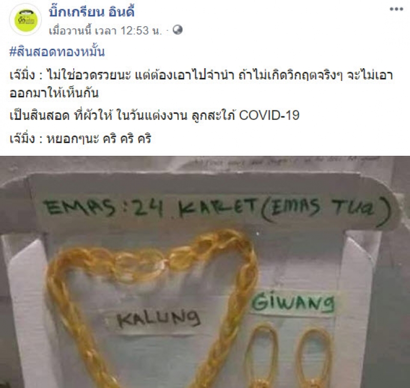 ล่าสุดทางเพจ บิ๊กเกรียน อินดี้ ได้ออกมาโพสต์ภาพเซ็ตเครื่องประดับจากหนังยาง ที่มองเผินๆ นึกว่าเป็นทองคำ โดยจากโพสต์นั้นระบุว่า