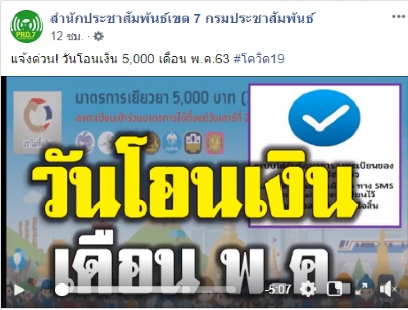 เมื่อวันที่ 24 เมษายน 2563 ทางเพจ สำนักประชาสัมพันธ์เขต 7 กรมประชาสัมพันธ์ ได้โพสต์คลิปวิดีโอเผยว่า ทางกระทรวงการคลังกำลังเร่งตรวจสอบคัดกรองผู้ที่ลงทะเบียนขอรับเงินช่วยเหลือ 5 พันบาท ซึ่งปิดยอดอยู่ที่ 28.8 ล้านคน ซึ่งจะทยอยโอนเงินให้กับผู้ที่ผ่านเกณฑ์อย่างต่อเนื่อง