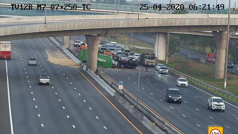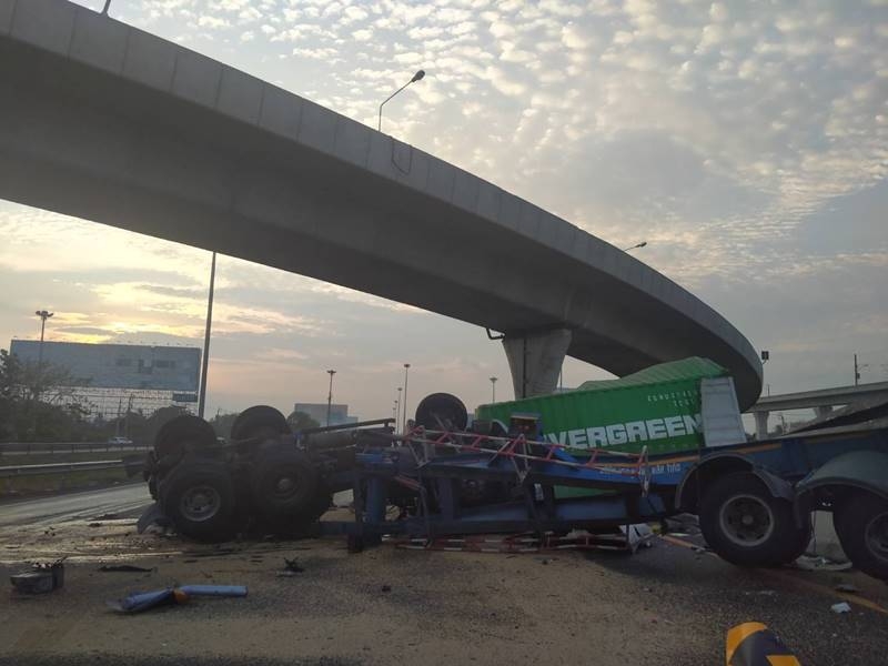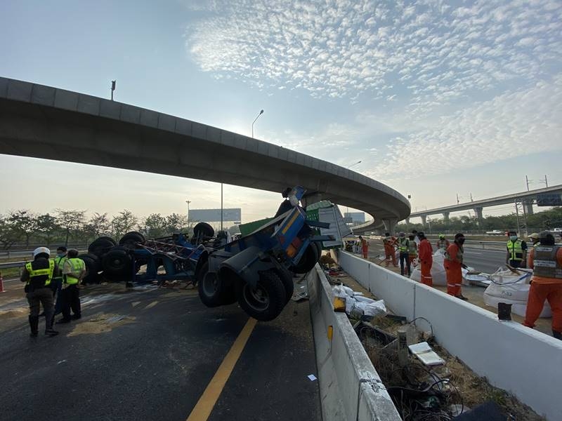 วันที่ 25 เมษายน 2563 ช่วงเช้าที่ผ่านมา ตำรวจทางหลวง ได้รับแจ้งเกิดอุบัติเหตุรถบรรทุกพ่วง 18 ล้อ ตกสะพานเบี่ยงจากถนนมอเตอร์เวย์ เข้าถนนวงแหวนกาญจนาฯ มุ่งหน้าบางปะอิน จึงรุดตรวจสอบ