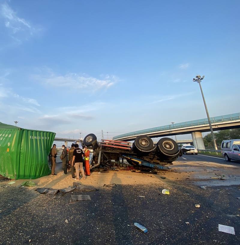 โดยที่เกิดเหตุบริเวณถนนมอเตอร์เวย์ มุ่งหน้าชลบุรี ช่องทางขวา พบรถพ่วง 18 ล้อ บรรทุกตู้คอนเทนเนอร์บรรจุข้าวเปลือกจำนวนมาก เสียหลักตกลงมาจากสะพานที่มีความสูง 6-7 เมตร ตรวจสอบพบคนขับรถพ่วงเสียชีวิตคาที่ ทราบชื่อ นายวิจักร อายุ 40 ปี