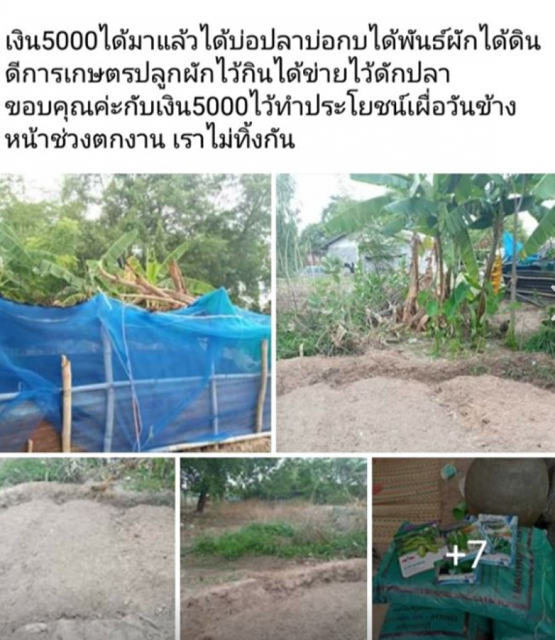 ล่าสุดมีสาวท่านหนึ่งได้ออกมาโพสต์ภา หลังได้เงินเหลือ 5000 แต่เธอกับนำ เงินจำนวนนี้ไปทำประโยชน์ยิ่งกว่าเดิมด้วยการซื้อปุ๋ยปละเมล็ดพันธุ์ผัก มาเพื่อปลูกไว้ นอกจากนี้เธอยังสร้างบ่อปลา ปลากบ เล็กๆเอาไว้เลี้ยงในยามว่าง เพื่อจับมาทานเองและหารายได้เสริมซึ่งเป็นการต่อยอดของเงิน 5,000 บาท ที่ได้รับไปดีมาก
