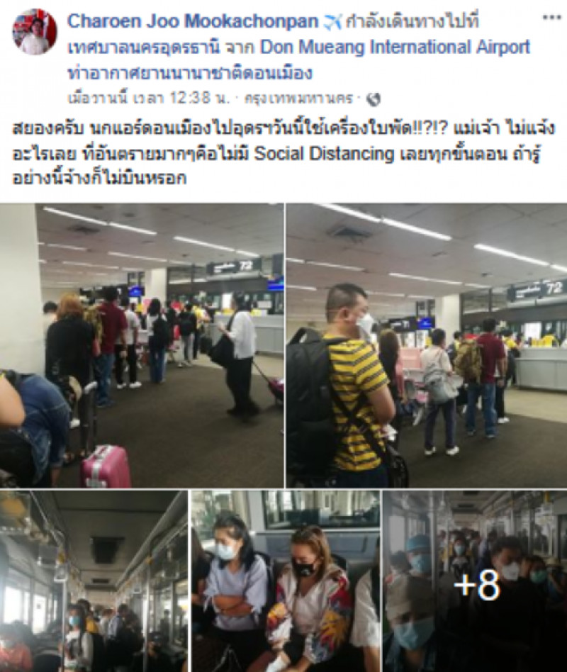 มีเฟชบุ๊กรายหนึ่ง ได้เผยแพร่ภาพระหว่างการเดินทางจากจังหวัดอุดรธานี ด้วยสายการบินแห่งหนึ่งซึ่งยังทำการบินอยู่ โดยพบว่า ไม่มีการจัดระเบียบเพื่อเว้นระยะห่างตั้งแต่การต่อคิวขึ้นเครื่องบิน การโดยสารรถของสายการบิน และการนั่งบนเครื่องบิน โดยเฟชบุ๊กรายนี้โพสต์ข้อความระบุว่า นกแอร์ดอนเมืองไปอุดรฯวันนี้ใช้เครื่องใบพัด แม่เจ้า ไม่แจ้งอะไรเลย ที่อันตรายมากๆคือ ไม่มี Social Distancing เลยทุกขั้นตอน ถ้ารู้อย่างนี้จ้างก็ไม่บินหรอก