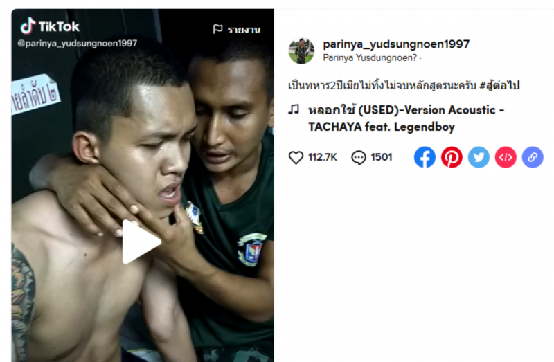 เรียกได้ว่าเป็นอีกหนึ่งเรื่องราว ที่ถูกพูดถึงอย่างมากในโลกออนไลน์ จากกรณีที่ผู้ใช้บัญชี Tiktok ชื่อ Parinya Yusdungnoen1997 ได้มีการโพสต์คลิปสุดเศร้า เมื่อหนุ่มทหารเกณฑ์ต้องปล่อยโฮ หลังจากที่ ช้ำรัก ถูกแฟนสาว ทิ้ง เพื่อนในค่ายจึงได้เข้ามาช่วยปลอบใจ