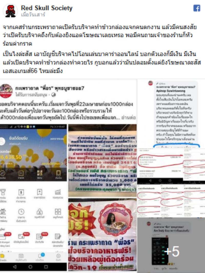 เรียกได้ว่าเป็นอีกหนึ่งเรื่อราว ที่โซเชียลเข้ามาวิพากษ์วิจารณ์กันเป็นจำนวนมาก หลังเพจดังอย่าง Red Skull Society ได้เปิดเผยเรื่องราวของร้านอาหารแห่งหนึ่ง ซึ่งติดป้ายแจกอาหารฟรีในช่วง covid-19แต่พบว่า มีการเปิดรับบริจาคเพื่อให้คนโอนเงินมาสมทบ แต่มีการตั้งข้อสังเกตว่า มีการซื้อโฆษณาผ่านเฟซบุ๊ก เพื่อให้คนเห็นโพสต์ขอสนับสนุนการทำข้าวกล่องมากขึ้น อีกด้วย