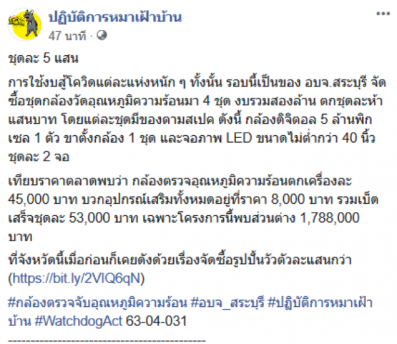 วันที่ 27 เมษายน ทางเพจ ปฏิบัติการหมาเฝ้าบ้าน ได้มีการโพสต์ เผย เรื่องกล้องวัดอุณหภูมิความร้อน ที่ใช้งบประมาณต่อชุดกว่า 5 แสน โดยระบุว่า